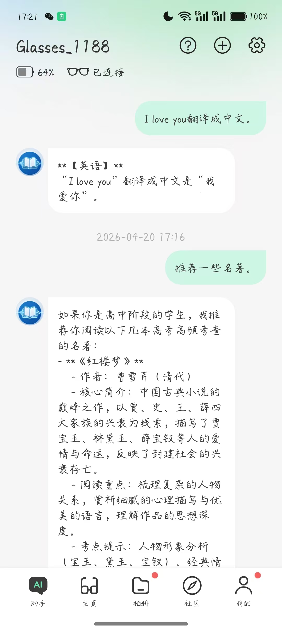 通过真机联调,连接glasses,通过眼镜端进入智能体交互,在眼镜端体验智能体的真实效果,因为不方便展示效果,这里通过手机后台来展示对话效果。