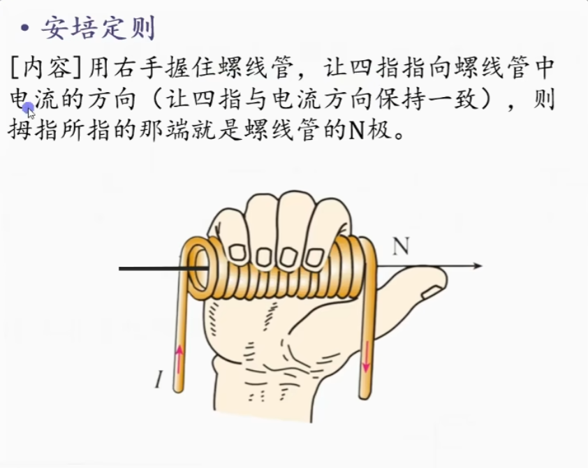 安培定则: 右手握住螺线管,,四指的方向是电流的方向,大拇指向N级,,