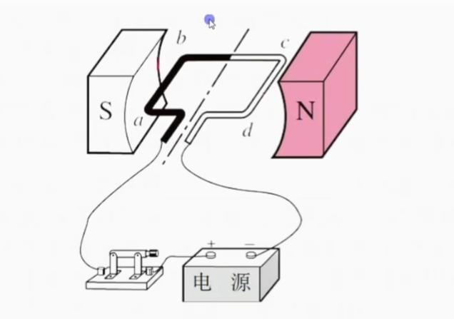 线圈的两个线头,直接作为转轴...架在两个导电金属支架上,转的时候,会接触到绝缘漆皮,,断电之后没有力,随着惯性到下一个平衡点