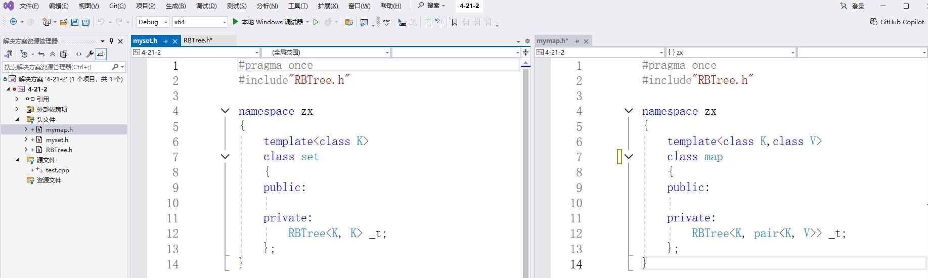 我们将红黑树的模拟实现的代码拷贝进我们的项目里面,然后再创建两个头文件,分别是myset和mymap,将set和map的实现放到命名空间zx里面,用来区别库里面的set和map。
