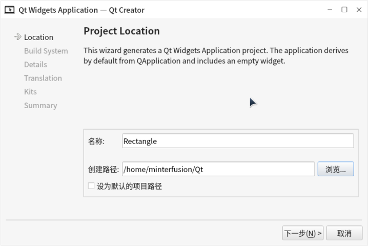 - 在Project Location(项目路径)设置界面(如图8),在「名称」一栏中填写Rectangle,「创建路径」选择不含中文、空格及特殊字符的路径(避免后续编译报错),点击「下一步(N)」。后续步骤均按默认设置点击「下一步(N)」,最后点击「完成(F)」按钮,完成项目创建。