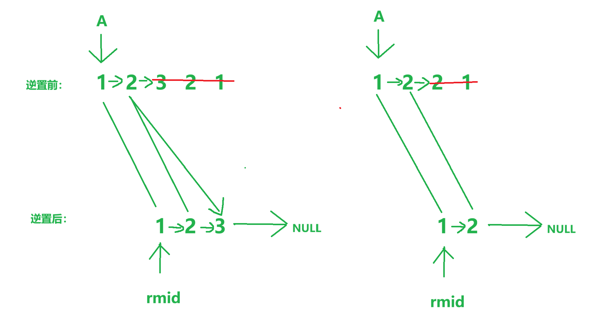 逆置之后由于前半段的2节点的下一个节点是3节点,那么正好符合一一对应;