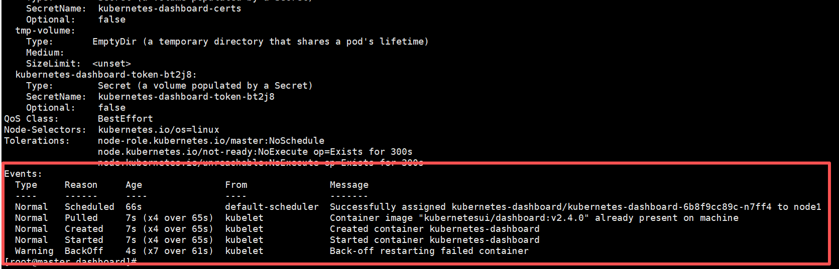 kubectl describe pod kubernetes-dashboard-6b8f9cc89c-n7ff4 -n kubernetes-dashboard