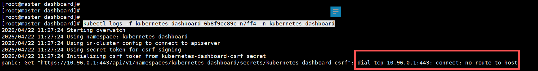 - 发现异常:dial tcp 10.96.0.1:443: connect: no route to host. 是pod内部网络问题导致无法连接