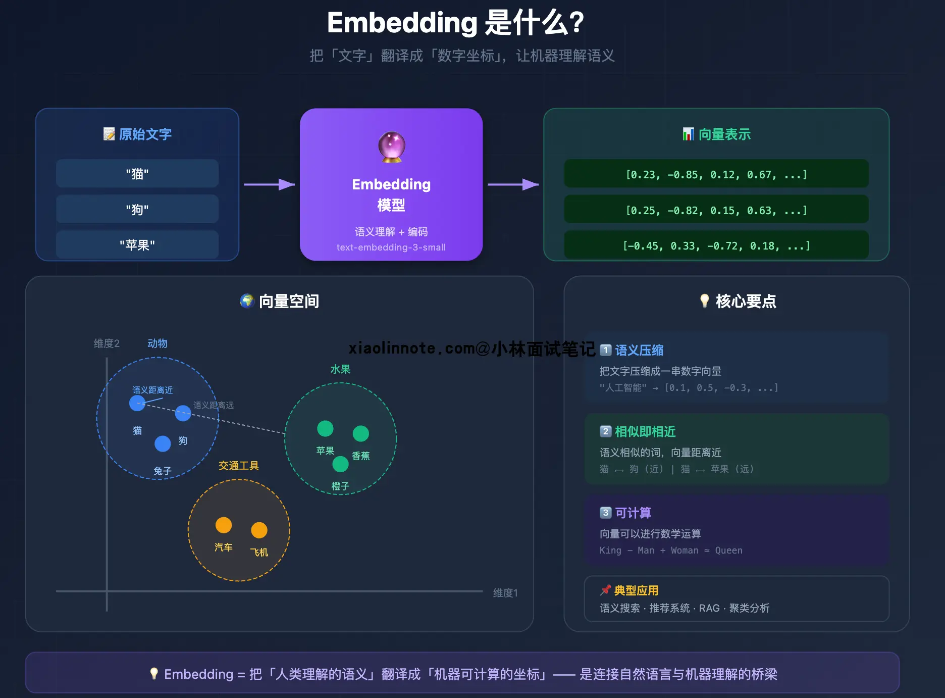 关键词匹配完全没用,因为这两句话没有一个共同的词。早期 NLP 系统为了解决这个问题,走向了「把词变成向量」这条路,向量空间里的距离代表语义距离,这就是 Embedding 的核心出发点。
