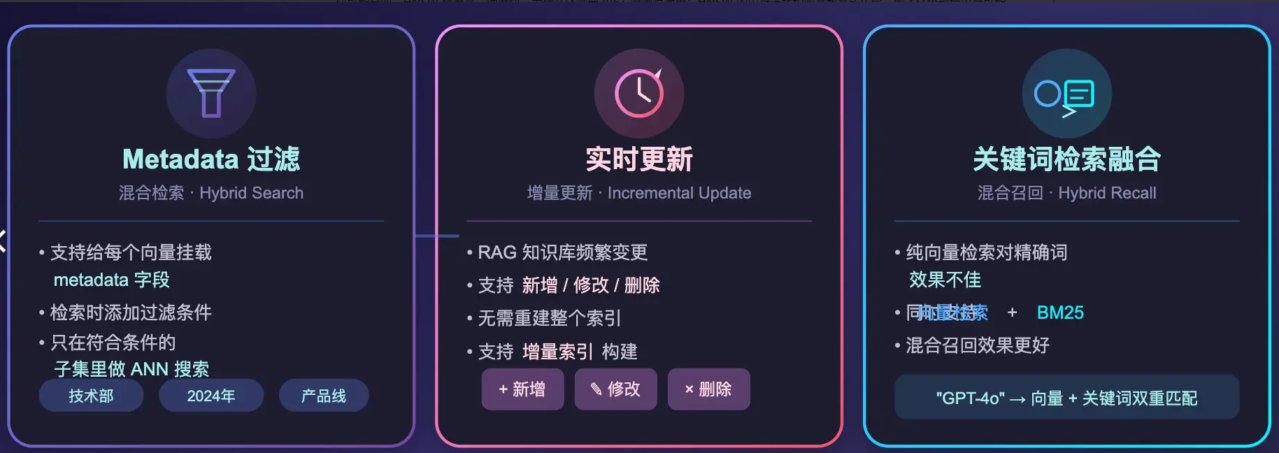 第三个是与关键词检索融合。纯向量检索对一些精确词语(比如产品型号「GPT-4o」、专有名词)的效果不好,有些向量数据库同时支持向量检索 + BM25 关键词检索,做混合召回效果更好。