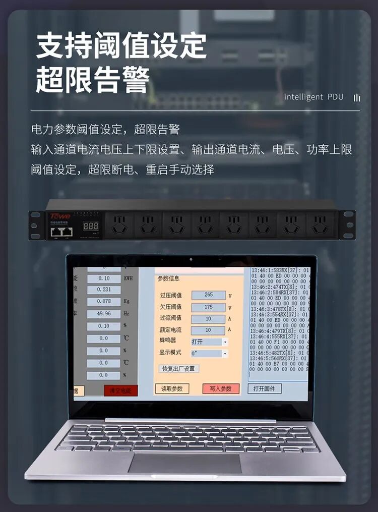 智能款 i-PDU 搭载嵌入式控制系统,支持端口级独立控制、远程开关机、定时上电、负载优先级调度,可通过 Web、SNMP、Modbus TCP、RS485 等协议接入 DCIM、动环监控平台;实时采集电压、电流、功率、电能、温湿度等参数,精度达 ±1%;提供多级阈值告警,支持声光、邮件、短信、平台推送,异常秒级响应,实现无人值守机房的主动式运维。产品通过 3C、CE 等国际认证,满足高密机柜、7×24 小时连续运行的严苛要求。