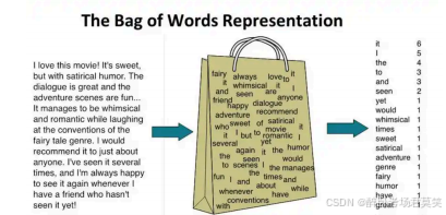 原理:将文本中的单词转换为向量,向量的每一维表示词汇表中一个单词在文本中出现的频率。该方法忽略了单词的顺序。