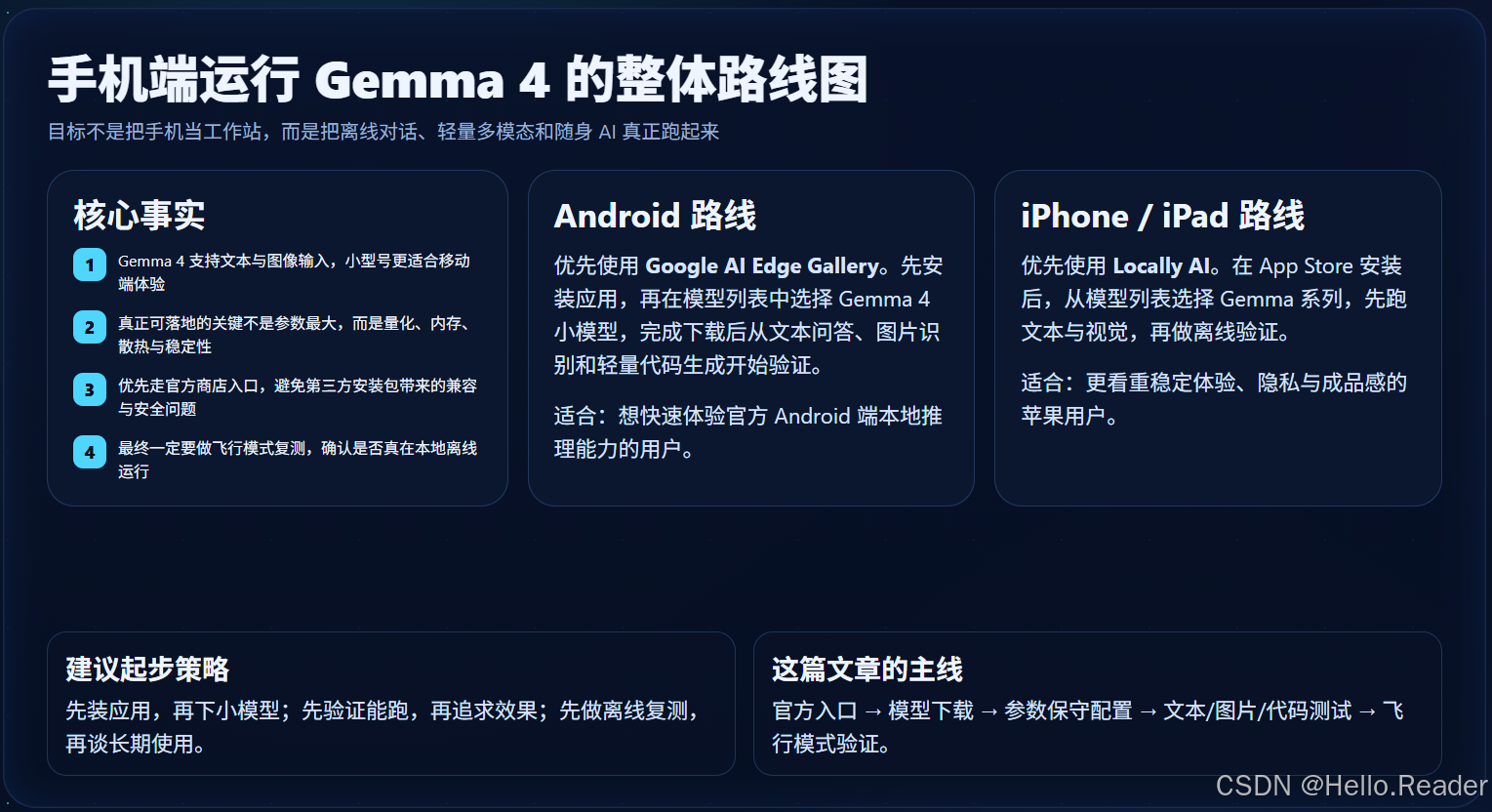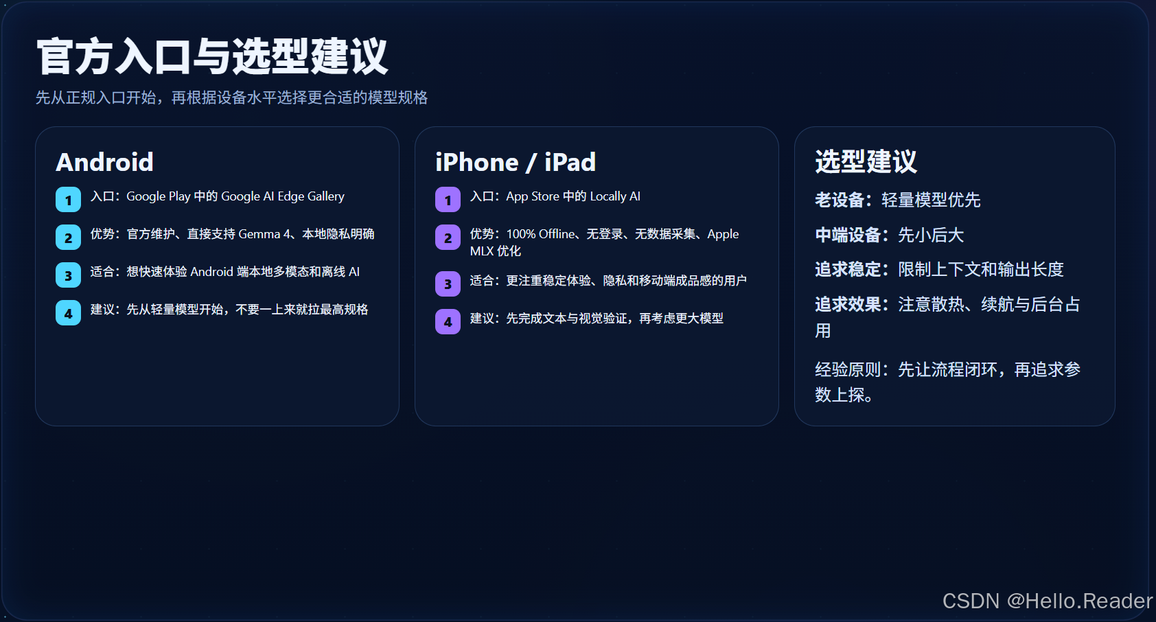 如果你只是想体验一次"手机离线看图、聊天、写点代码"的本地 AI,那么 Android 侧走 Google AI Edge Gallery,iPhone / iPad 侧走 Locally AI,已经足够把这件事跑通。