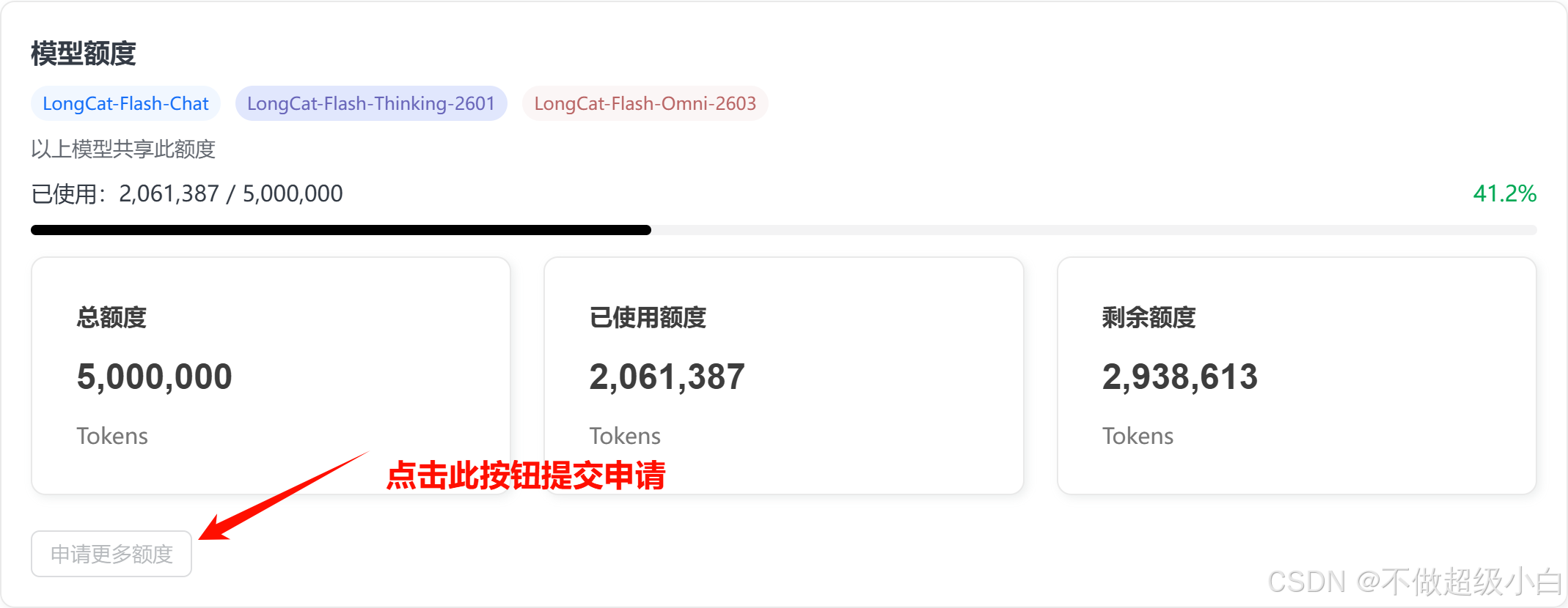 目前还属于公测阶段,类似之前xiaomi-mimo的免费两周活动,没有充值渠道,所以众生平等,大家都只能用免费额度,不过可以e-mail联系longcat-team@meituan.com并附带上一个自己在用的api key,有可能获得更多额度。