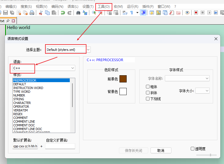 在Notepad++的菜单栏【工具】--》语言格式设置 --》语言:C++,如图(3)所示: