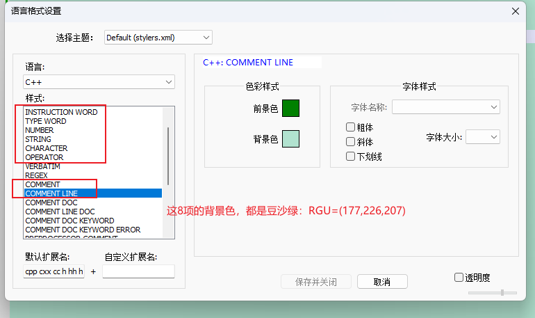同理,设置 INSTRUTION WORD、TYPE WORD、NUMBER、STRING、CHARCTER、OPERATOR、COMMENT、COMMENT LINE的背景颜色,都为 豆沙绿:RGU = (177,226,207)。