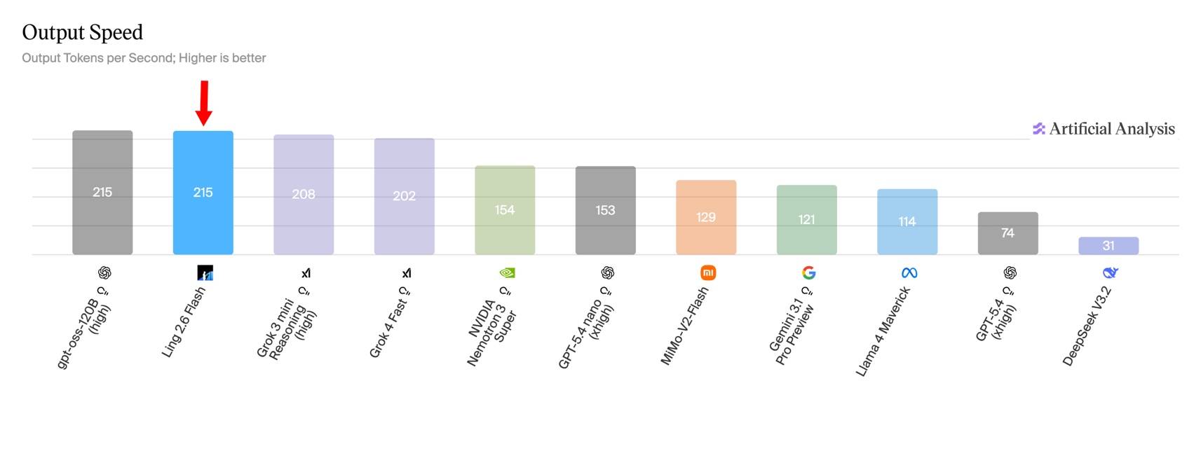 Ling-2.6-flash 沿用了 Ling 2.5 的混合线性架构设计,这种高度稀疏化的 MoE 架构在硬件表现上优势明显。在 4 卡 H20 条件下推理速度最快可达到 340 tokens/s,Prefill 吞吐达到 Nemotron-3-Super 的 2.2 倍。在 Output Speed 测评中,Ling-2.6-flash以 215 tokens/s 的稳定输出速度位列同参数级别模型的第一梯队。