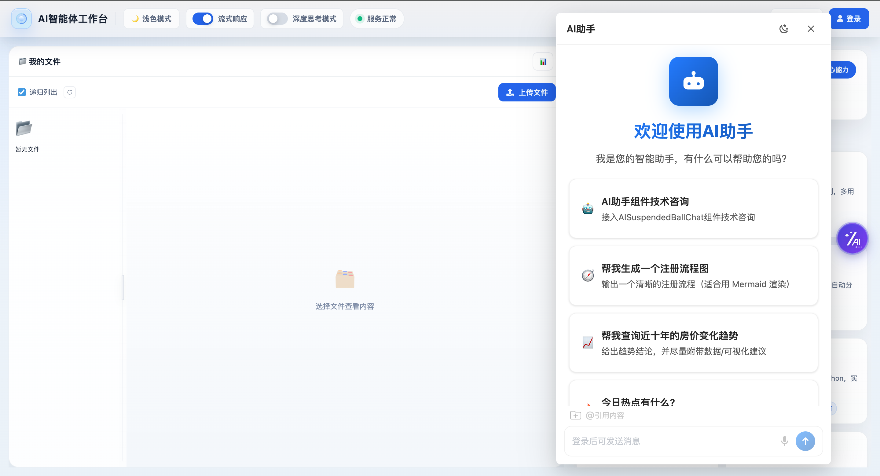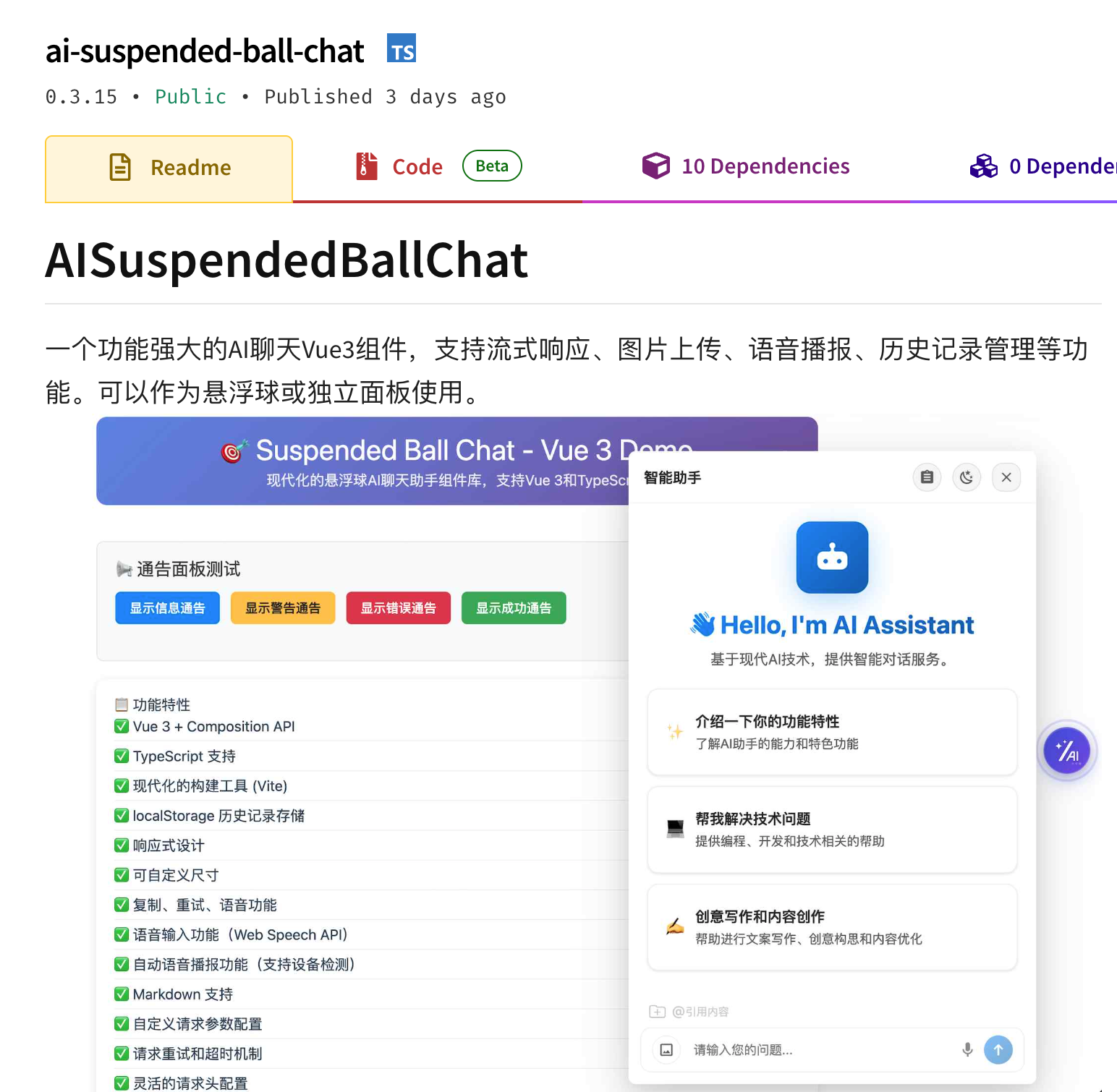 AI Suspended Ball Chat 是一个 Vue3 的 AI 聊天组件,既可以作为悬浮球客服入口 ,也可以作为独立聊天面板使用。