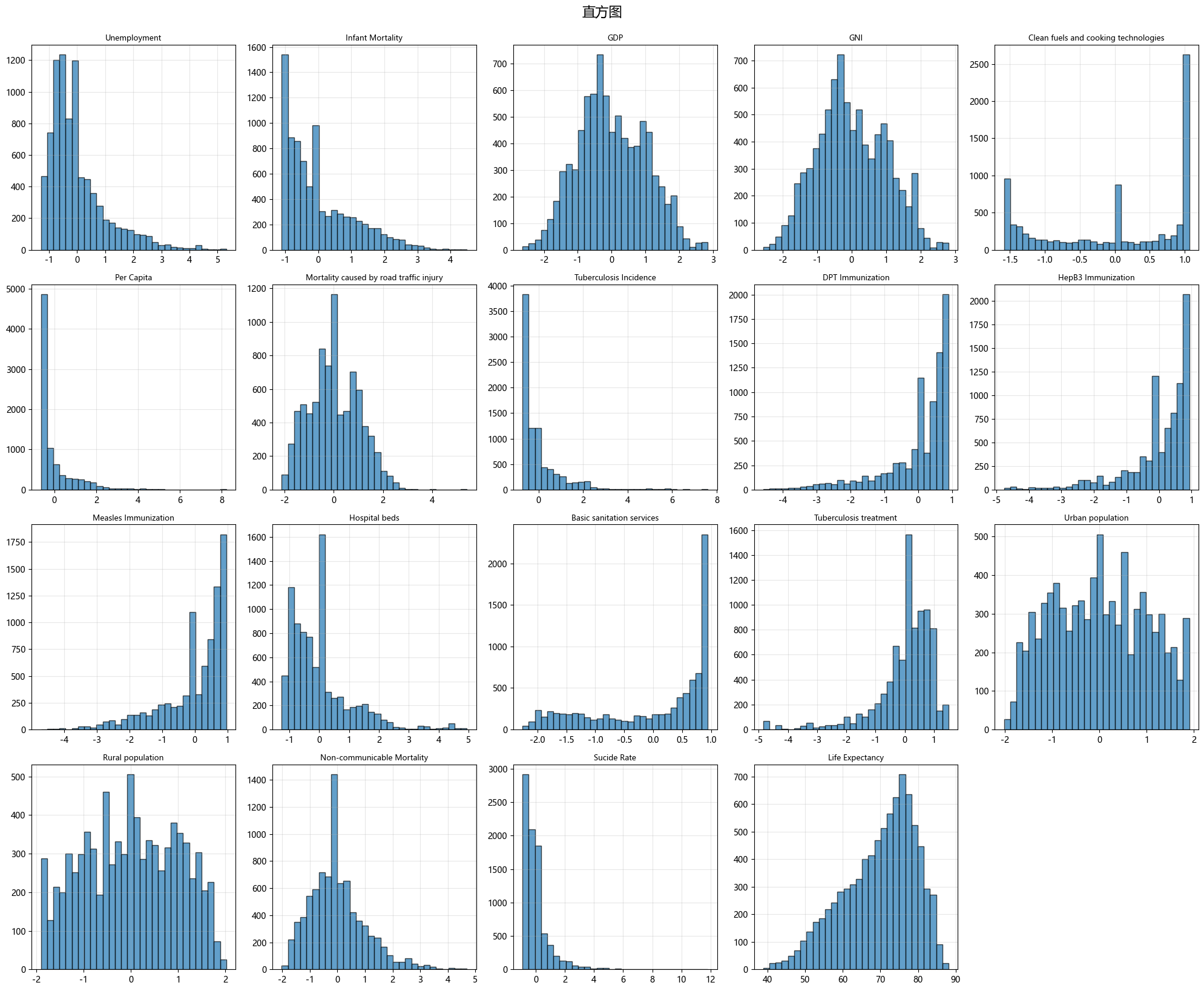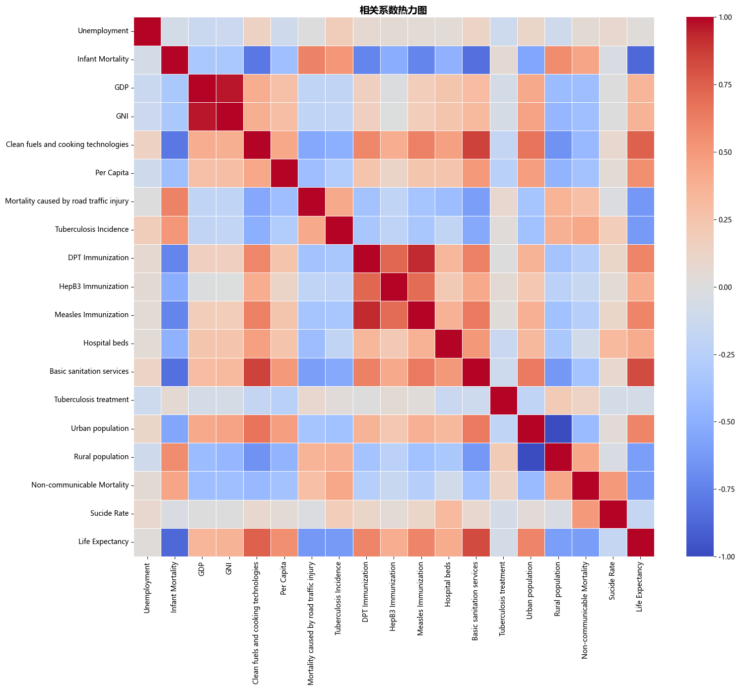 本文数据来源于Kaggle平台整理的预期寿命数据集,共包含18个特征指标。分别是(1)Unemployment(失业率);(2)GDP(国内生产总值);(3)GNI(国民总收入);(4)Per Capita(人均指标,通常搭配 GDP/GNI 使用);(5)Urban population(城镇人口 );(6)Rural population(农村人口);(7)Infant Mortality(婴儿死亡率);(8)Clean fuels and cooking technologies(清洁燃料与烹饪技术);(9)Basic sanitation services(基础卫生服务);(10)Mortality caused by road traffic injury(道路交通伤害死亡率);(11)Tuberculosis Incidence(结核病发病率);(12)Tuberculosis treatment(结核病治疗覆盖率 / 完成率);(13)Non-communicable Mortality(非传染性疾病死亡率);(14)Sucide Rate(自杀率);(15)DPT Immunization(百白破疫苗接种率);(16)HepB3 Immunization(乙肝 3 针疫苗接种率);(17)Measles Immunization(麻疹疫苗接种率);(18)Hospital beds(医院床位数 / 每千人床位数)。