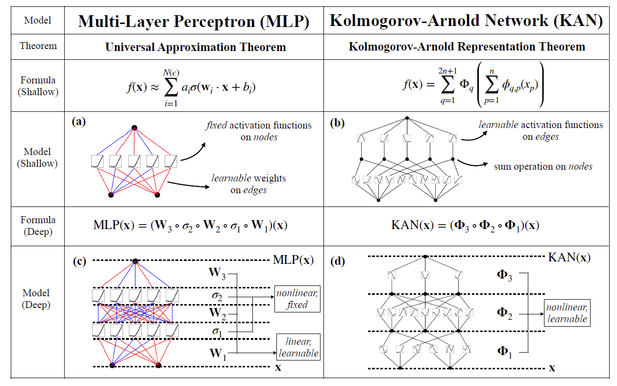 KAN(Kolmogorov‑Arnold Network)是基于科尔莫戈罗夫‑阿诺德表示定理提出的新型神经网络,多层感知器(MLP) 在节点("神经元")上具有固定的激活函数,而 KAN 在边("权重")上具有可学习的激活函数。在数据拟合和 PDE 求解中,较小的 KAN 可以比较大的 MLP 获得更好的准确性,与传统的MLP 相比,KAN 有4个主要特点[3]:
