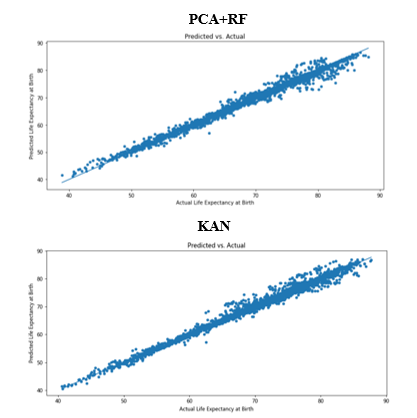 表2对比结果显示,KAN 模型在预期寿命预测中表现最优。虽然 PCA+RF 模型[6]取得了 0.9848 的高 R2,但 KAN 模型在 MAE、MSE、RMSE 及 MAPE 指标上均表现更低,分别达到 0.7469、1.3258、1.1514 与 0.0107。这充分证明 KAN 模型在处理预期寿命相关的复杂生理数据时,具备更强的非线性拟合能力与泛化能力,其预测准确性显著优于基于 PCA 特征提取的随机森林模型。通过对比PCA+RF与KAN模型的预测值与真实值散点图7可以发现,两种模型均呈现出良好的正相关趋势,预测值与真实值高度拟合。但在数据离散程度与拟合精度上,KAN 模型展现出明显优势。从散点分布形态来看,PCA+RF 模型的散点虽整体沿对角线分布,但在中高数值区间(存在一定程度的离散,且部分点偏离 1:1 参考线略远;而KAN 模型的数据点分布更为紧凑、密集,几乎无明显的离群点,整体预测稳健性显著优于基于 PCA 特征降维的随机森林模型。