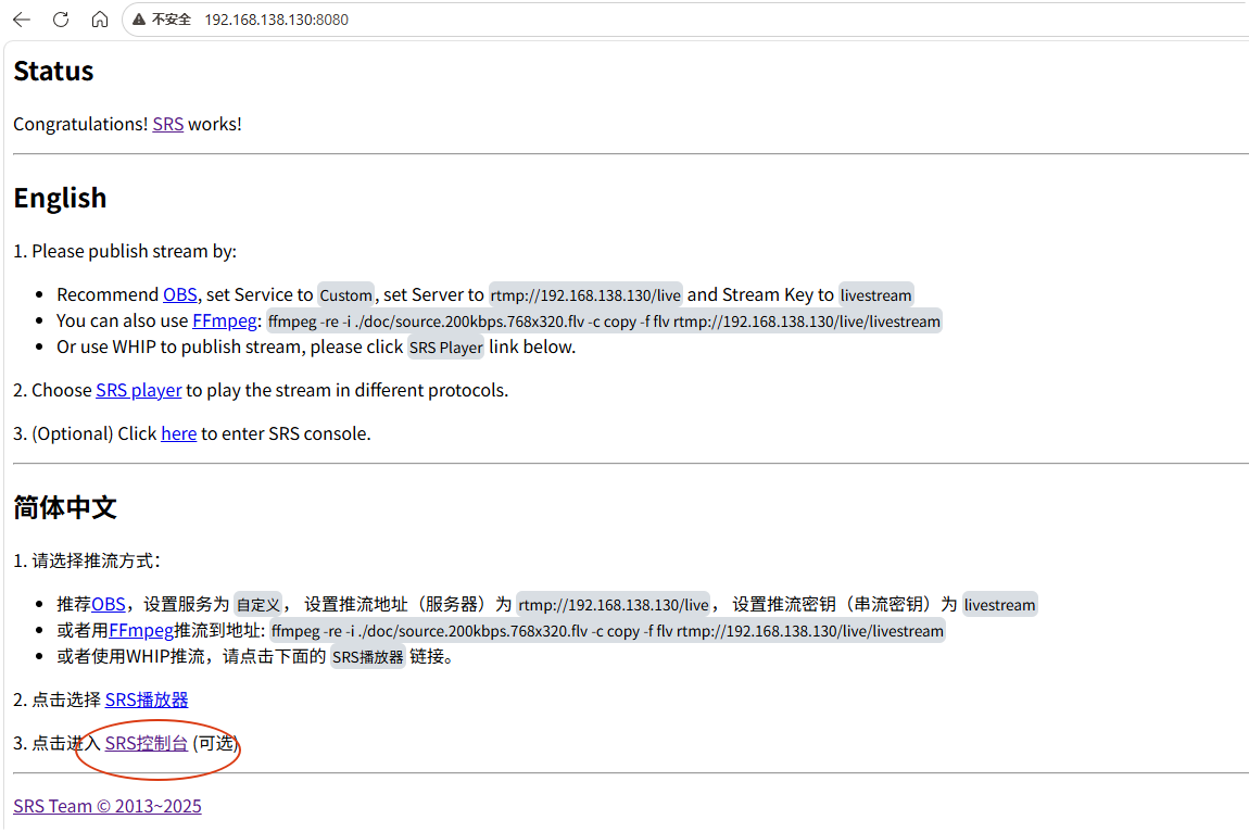 srs有个http网页可以管理服务器,打开地址:http://192.168.138.130:8080/