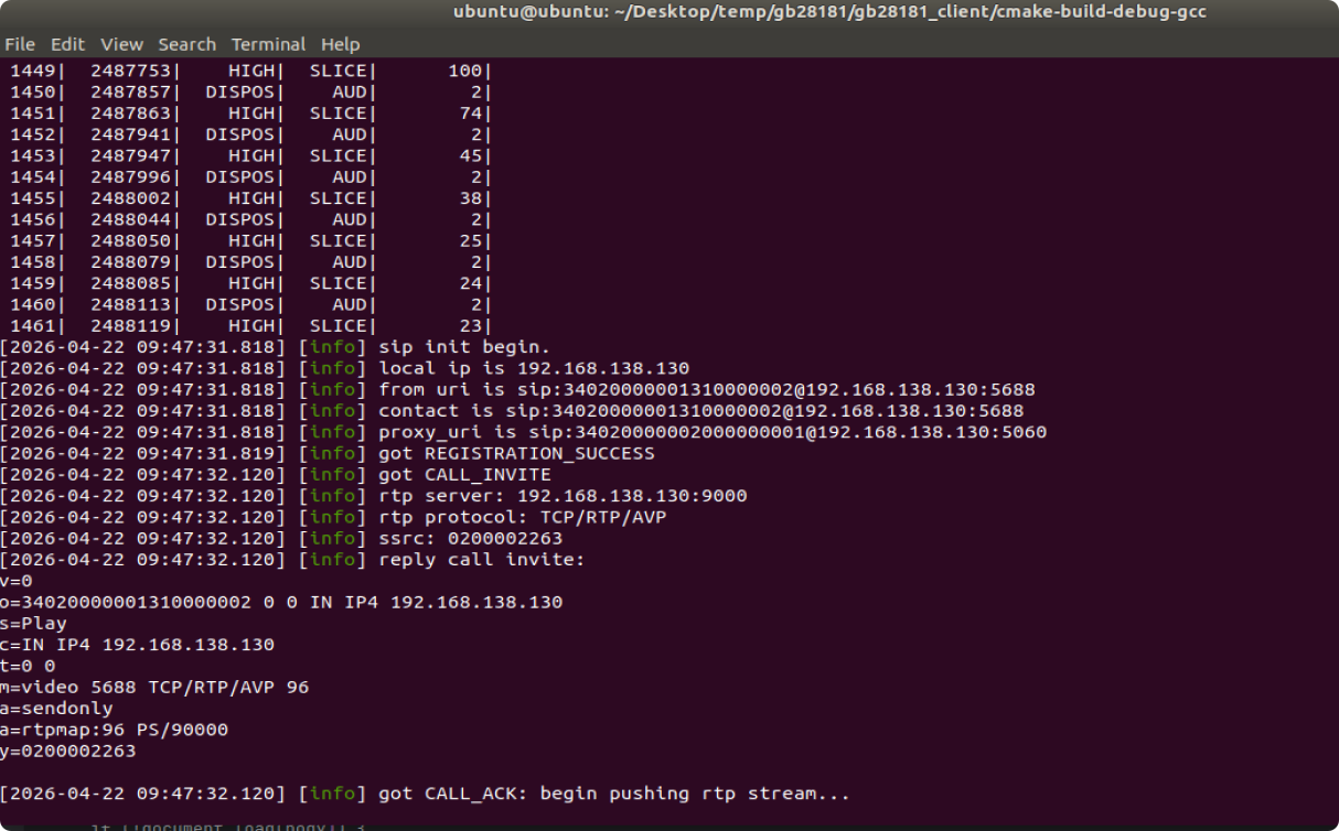 ubuntu@ubuntu:~/Desktop/temp/gb28181/gb28181_client/cmake-build-debug-gcc$ ./gb28181-client --server-ip 192.168.138.130 --server-id 34020000002000000001 --server-port 5060 --device-id 34020000001310000002 --username admin --password admin --filepath ../samples/bigbuckbunny_1280x720_24fps_annexb_012.h264