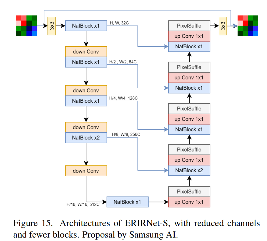 | 模型结构 | 基于 NAFNet 架构改进,设计了两个变体: 1. ERIRNet-S (General):简化版NAFNet,减少通道数和编解码块数量。 2. ERIRNet-T (Efficient):进一步减少Block数量,使用更小的FFN扩展比,将PixelUnshuffle替换为ConvTranspose以适应参数限制。 核心组件:NAFBlock(用于去噪和去模糊)。 |