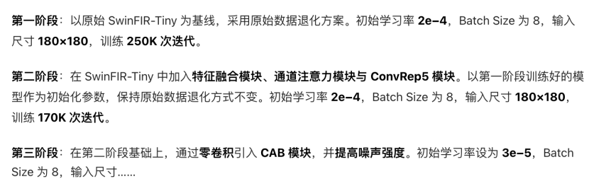 | 训练策略 | 四阶段渐进式训练: 1. 基线训练 (250K iters)。 2. 添加特征融合、通道注意力和ConvRep5 (170K iters)。 3. 引入CAB模块(零卷积)并增加噪声强度 (140K iters)。 4. 微调(降低学习率,减小Batch Size至2,增大输入尺寸至360x360)。 增强:使用 Mixup 数据增强。 |
