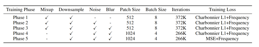 | 损失函数 | Stage 1-4 : Charbonnier Loss + Frequency Loss。 Stage 5 : MSE + Frequency Loss。 |