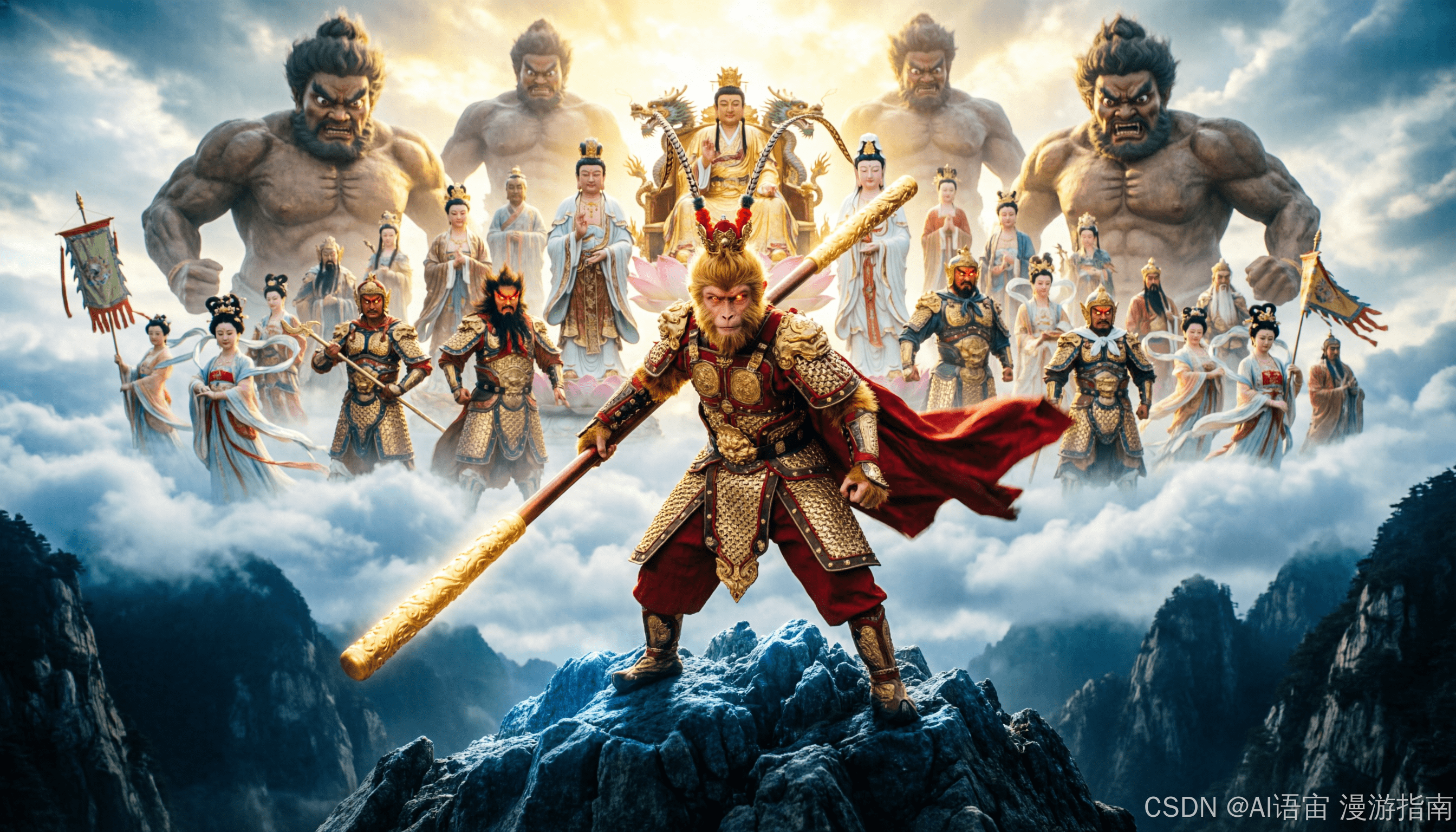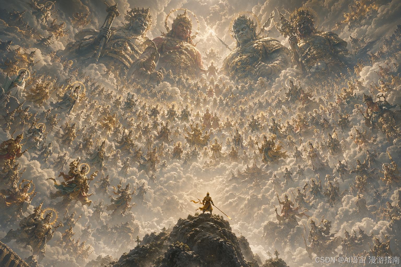 Prompt:生成图片,仰视视角。孙悟空一人立于山巅,持棒而立,面对漫天神佛。 天上神仙密密麻麻,几句压迫感。 镜头从悟空身后很远处拍摄,向上视角。 超广角。漫天神佛的后面有身形巨大的四大金刚。