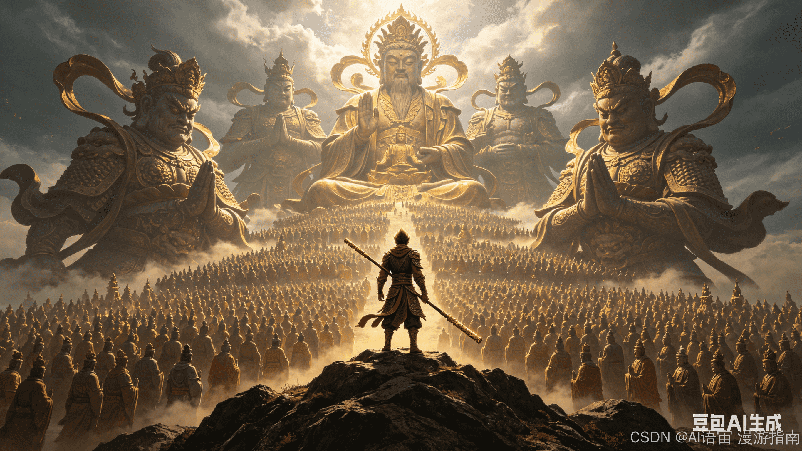 - 豆包 :中规中矩,在预期之内。感觉模型没有理解到漫天神佛应该是什么样的, 更像是孙悟空参观兵马俑🤣。而且神佛的重复率很高,感觉都是一个模子刻出来的。