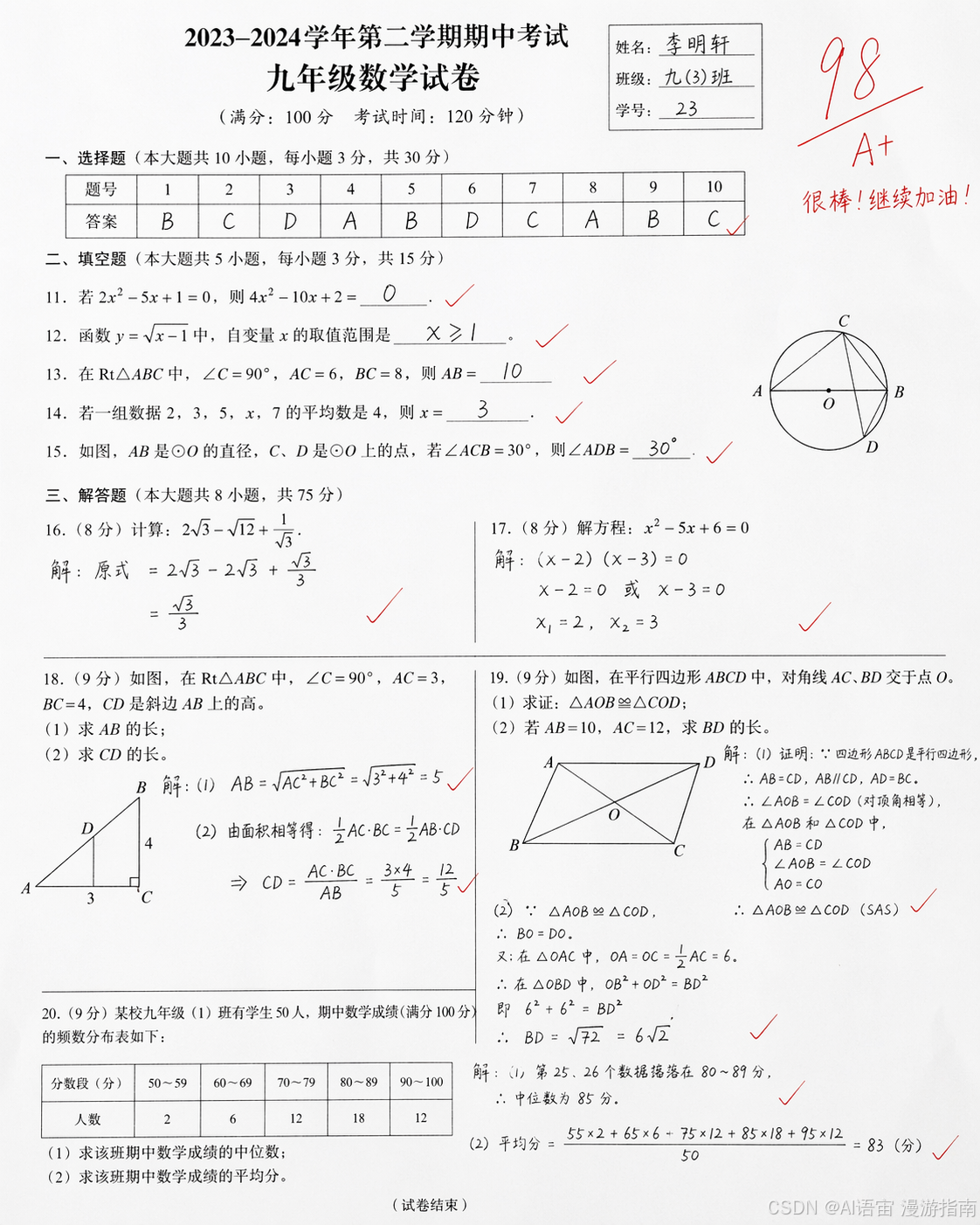 要挑毛病的话,其实也能看出点问题:要求总分100分,生成的试卷顶部也写了满分100,但各部分加起来却是120分。另外还有第18题,AB边的高画错了,应该是连接CD。(应该还有其他不对的地方,我没仔细看,大家可以在评论区补充哦 )。不过总的来说,相当惊艳。包括16、17题的解题步骤也都是对的,真的离谱。