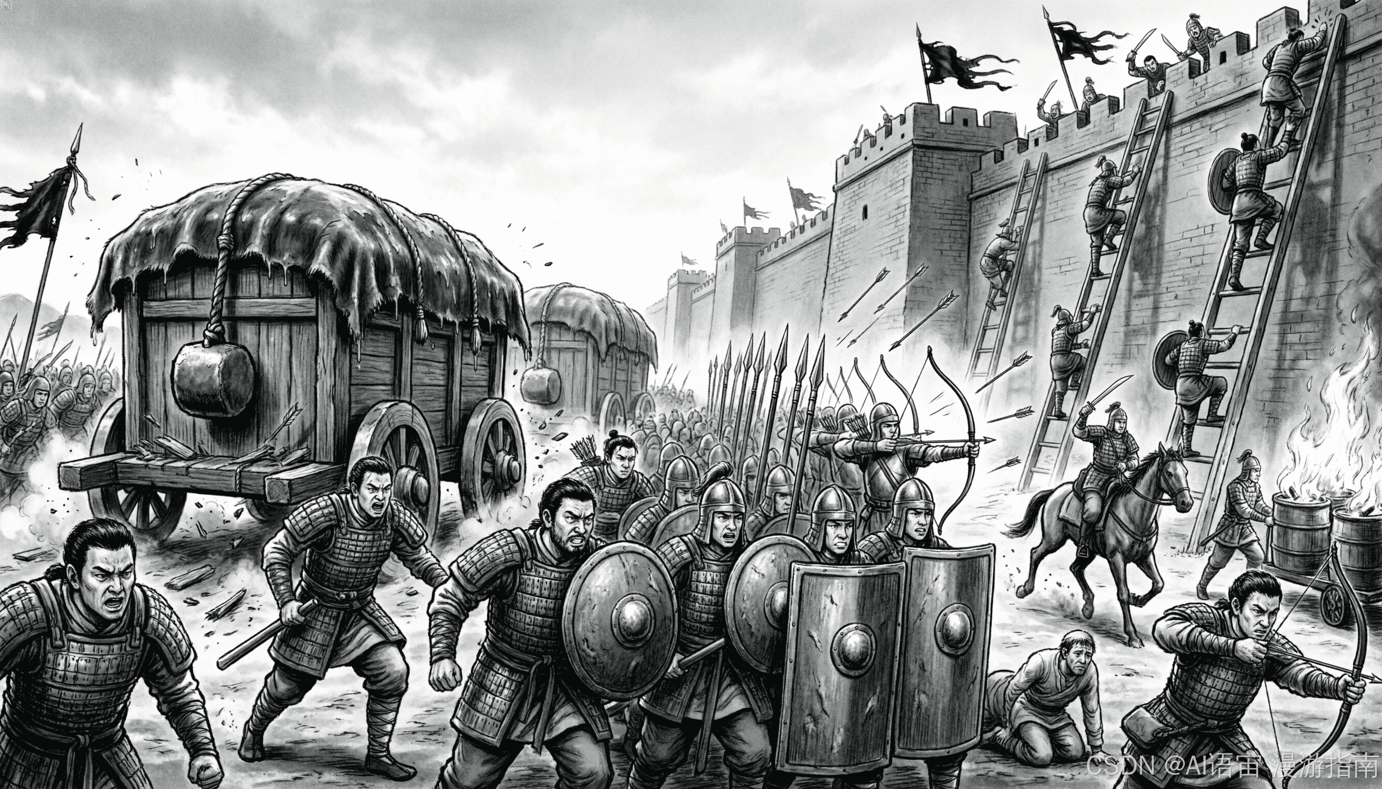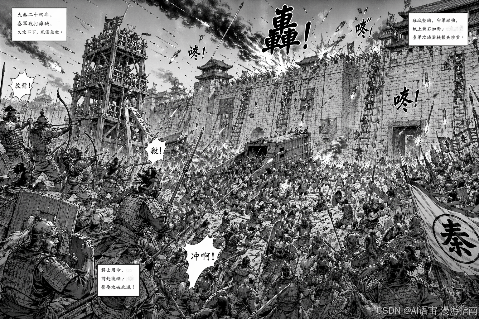 Prompt:生成一副内容极其丰富的黑白漫画。漫画中是一副攻城图,有攻城车,有云梯,有弓箭手,有盾兵,有长枪,总之是各种各样的古代军队,正在攻打一座城。 超广角,画面内容经极其丰富,人物形态各异。