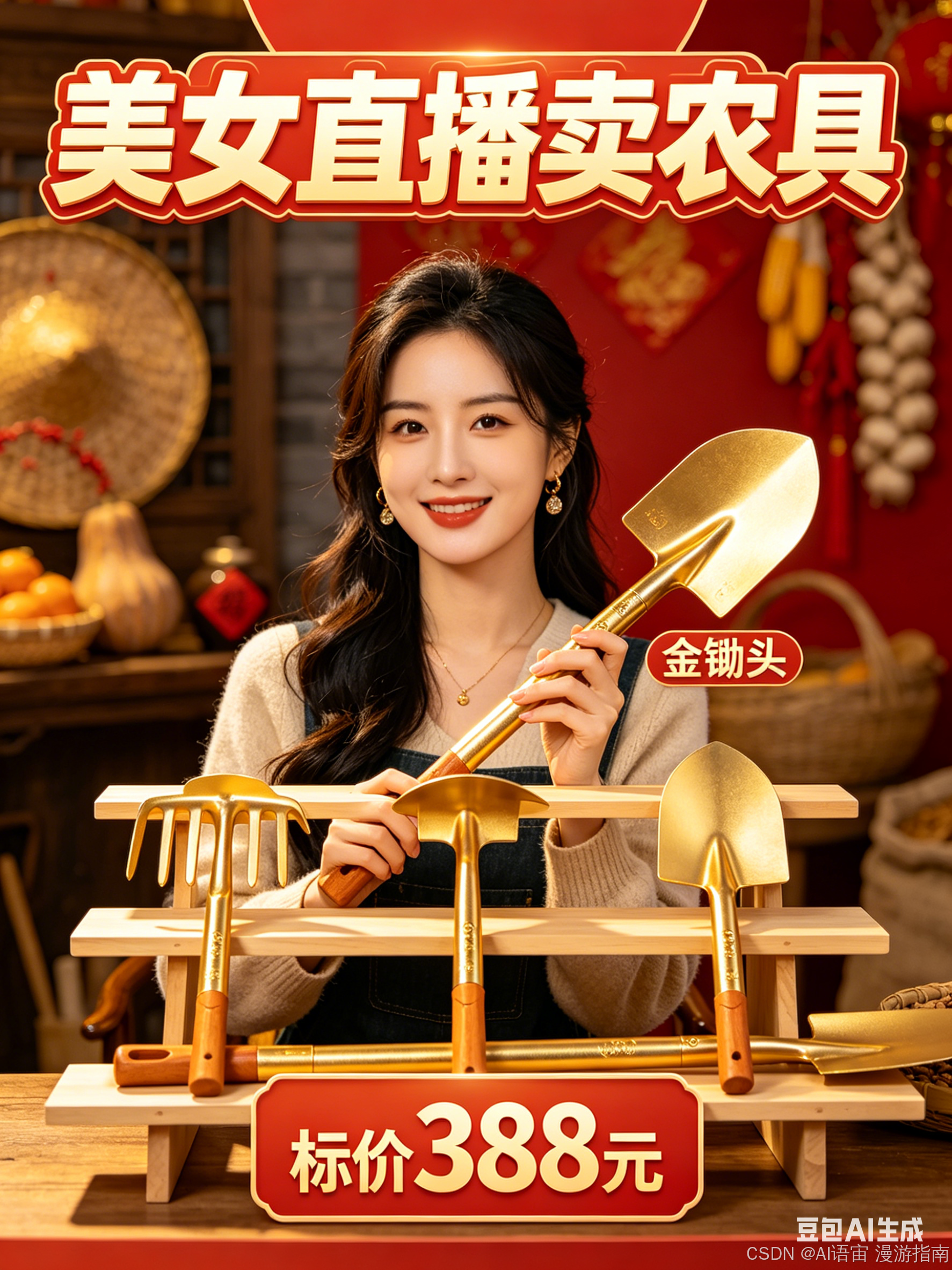 Prompt:生成美女直播卖农具的图片。卖的是金锄头,标价388。