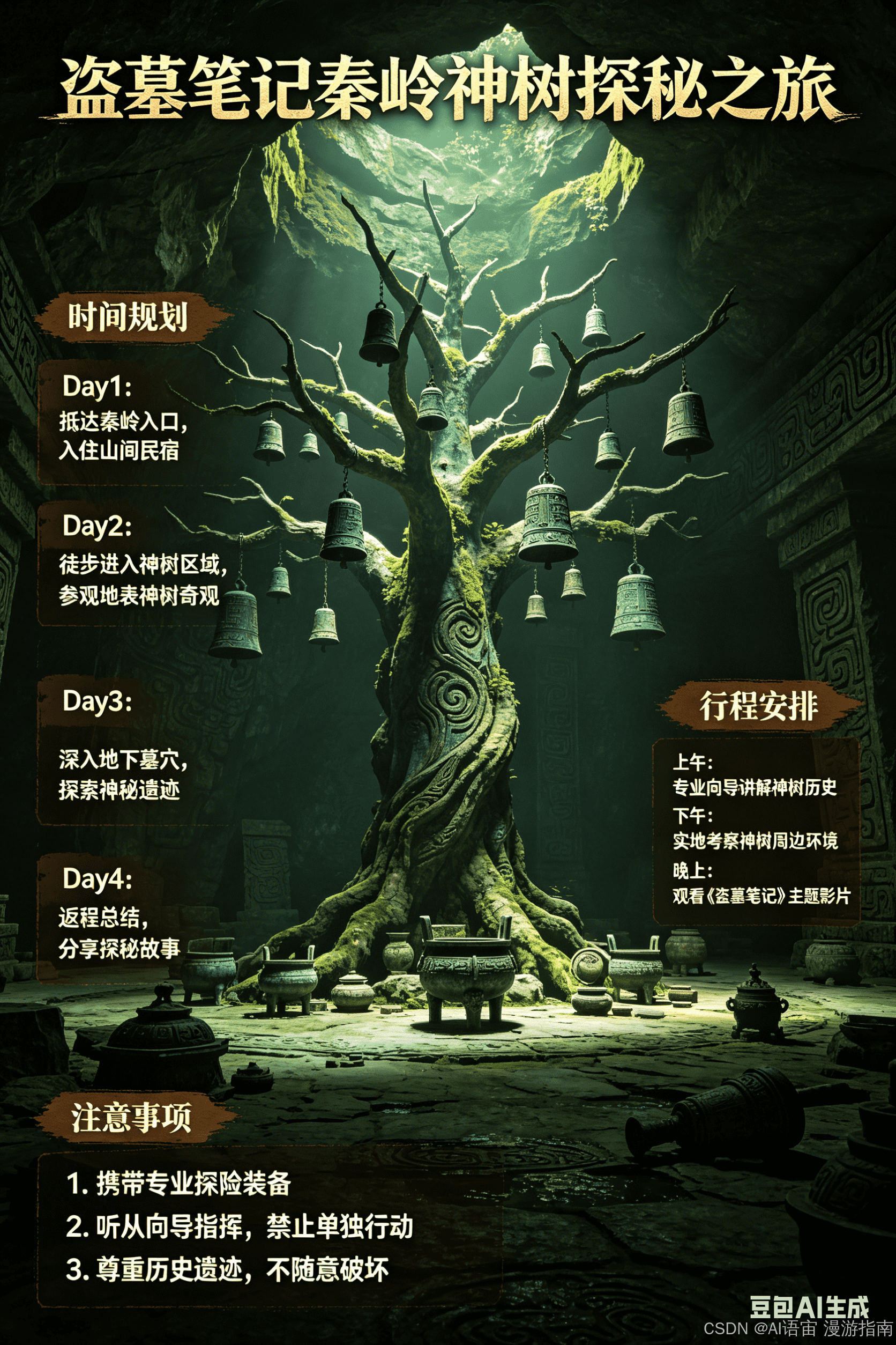 Prompt:一张盗墓笔记秦岭神树的旅游宣传图。上面有详细的时间规划,行程安排,注意事项。以及一些图片可以看到秦岭神树的地下墓穴的超壮观,超神秘,超恐怖的镜像。