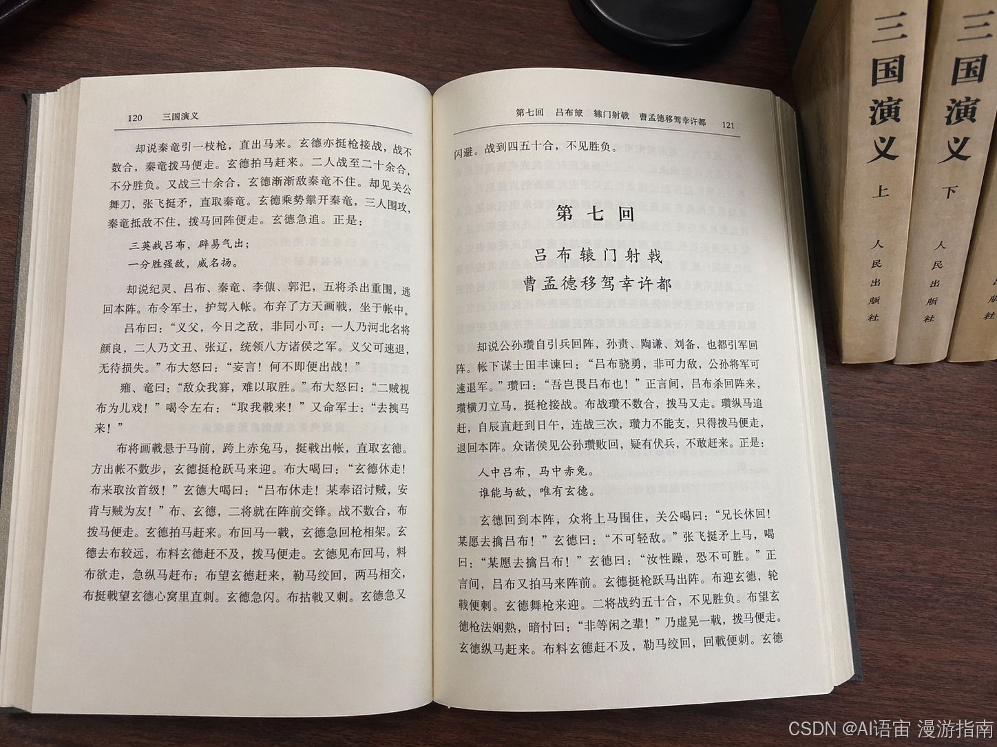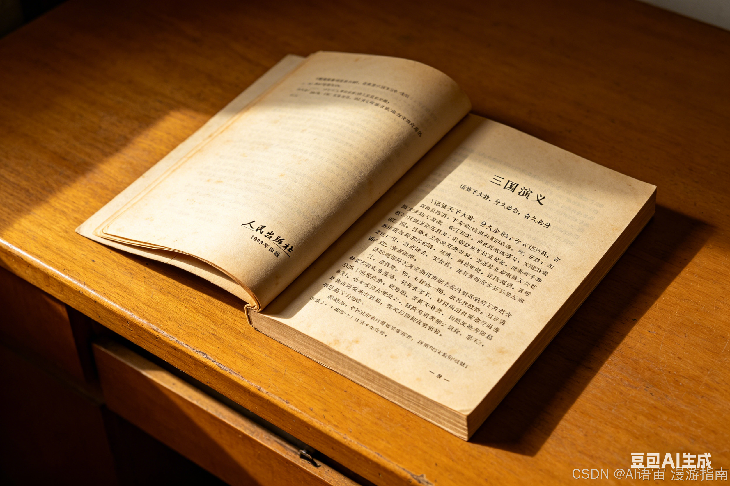 Prompt:生成一个图片。图片是一本摊开在书桌上的书。书的内容是1998年人民出版社出版的《三国演义》。书中的内容是真实的。