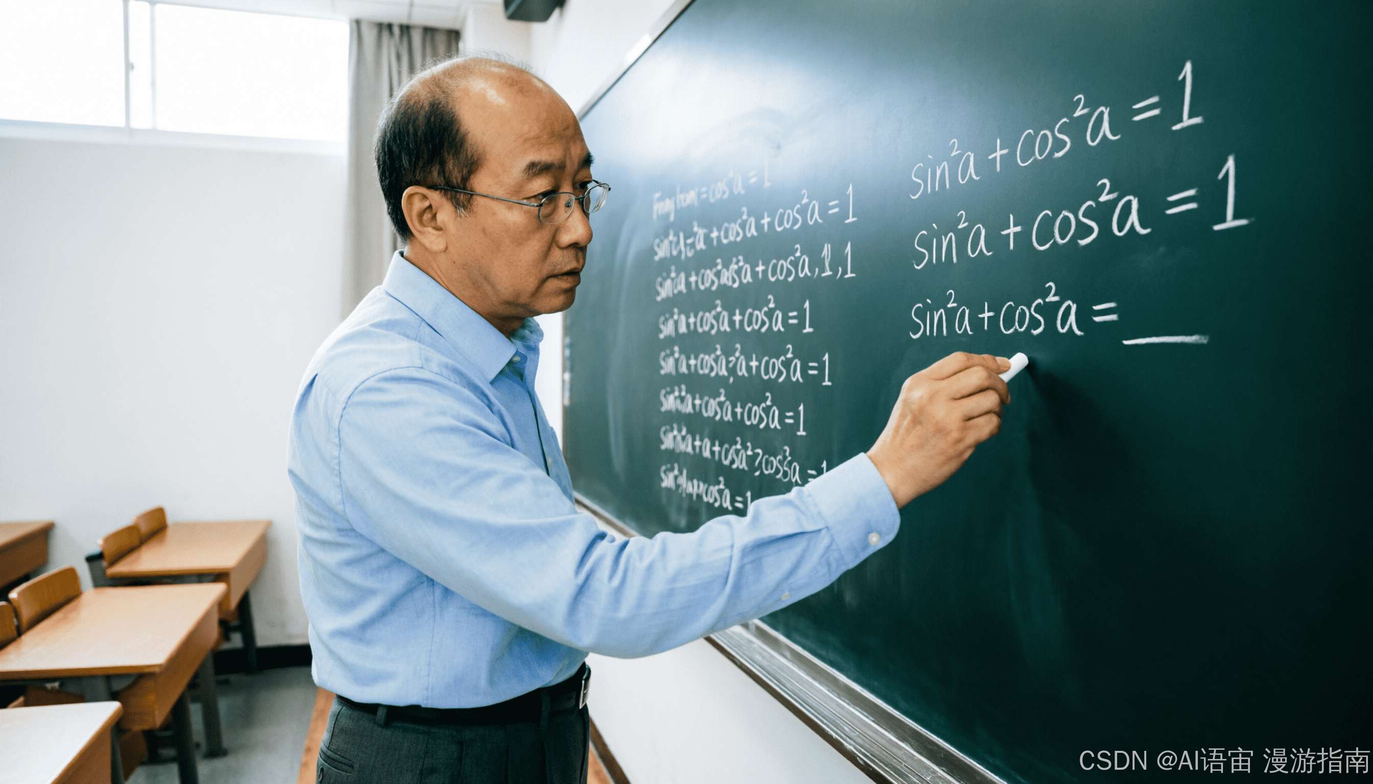 Prompt :高中课堂,一个略微谢顶男老师正在黑板上奋笔疾书。黑板的左半边已经写满了,老师正在写右半边。 左半边写的是 sin²a+cos²a=1 的证明过程。(上难度了啊,还要生成公式的证明)