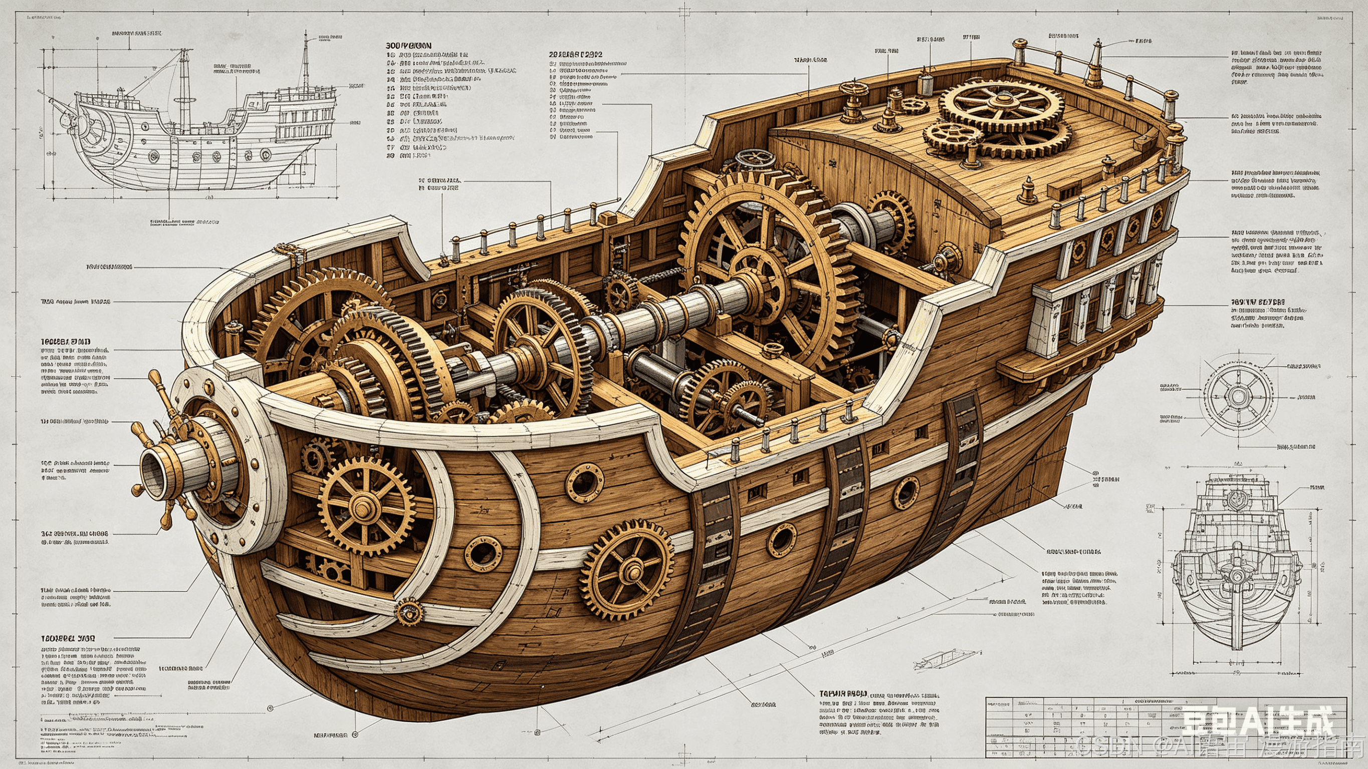 Prompt:生成海贼王冥王号大船的设计图。设计图纸极其复杂,超过3000个细节说明。整个船采用木质结构,但是内部机械结构很多,有极其复杂的齿轮以及传动轴等。