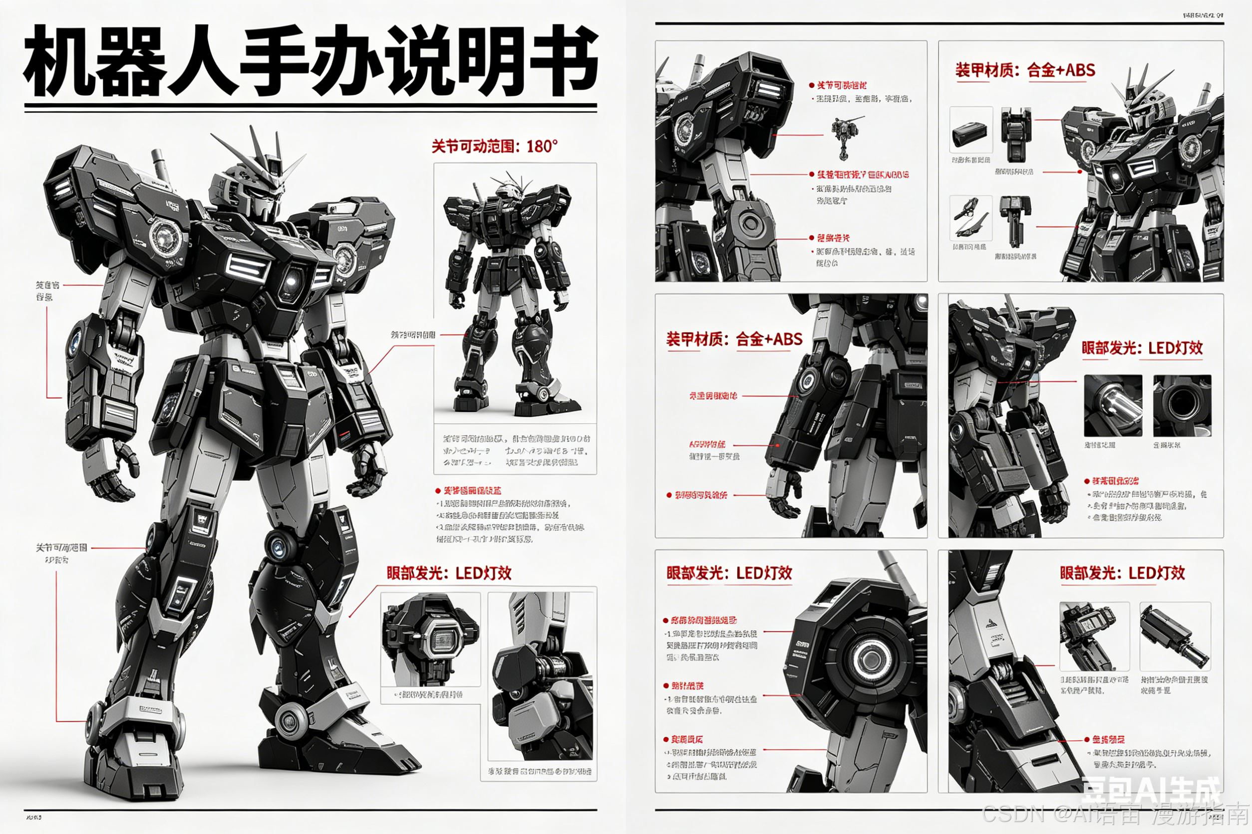 Prompt:生成一个机器人手办的说明书图片。机器人很精美,很多细节。说明书对机器人的每个细节有详细的说明。