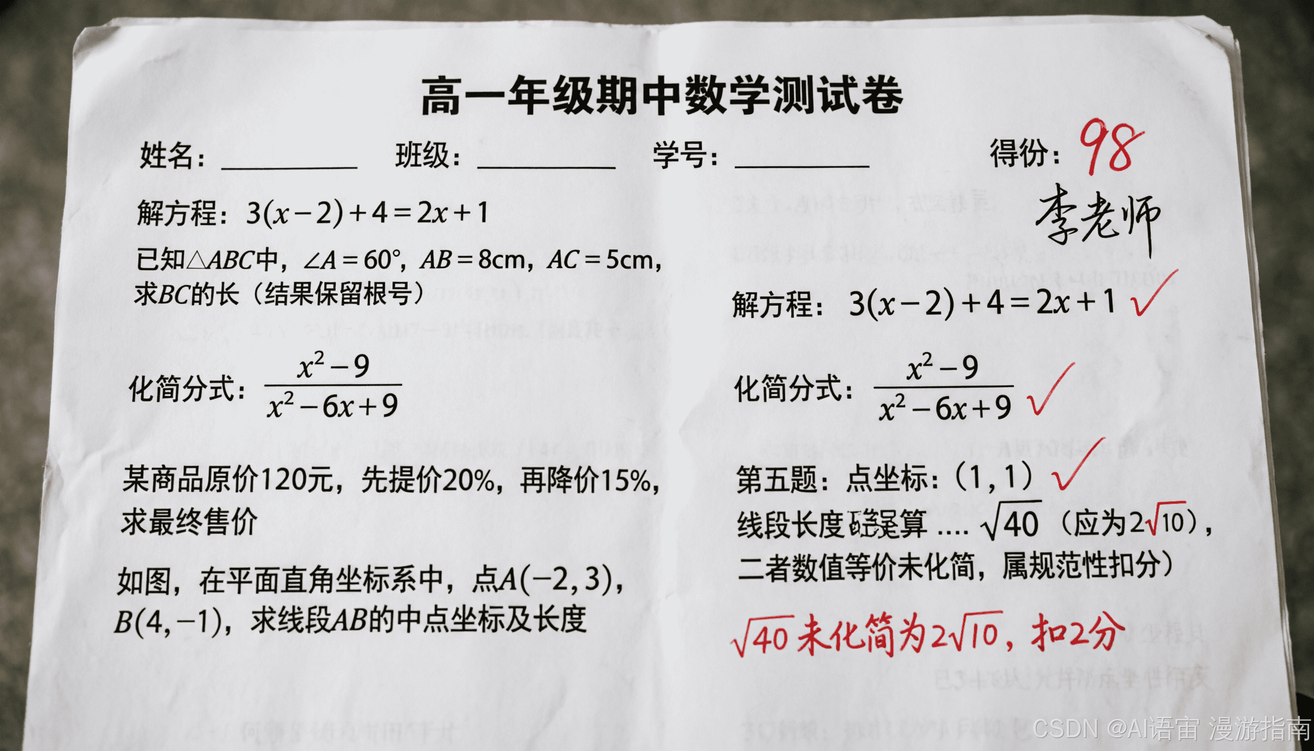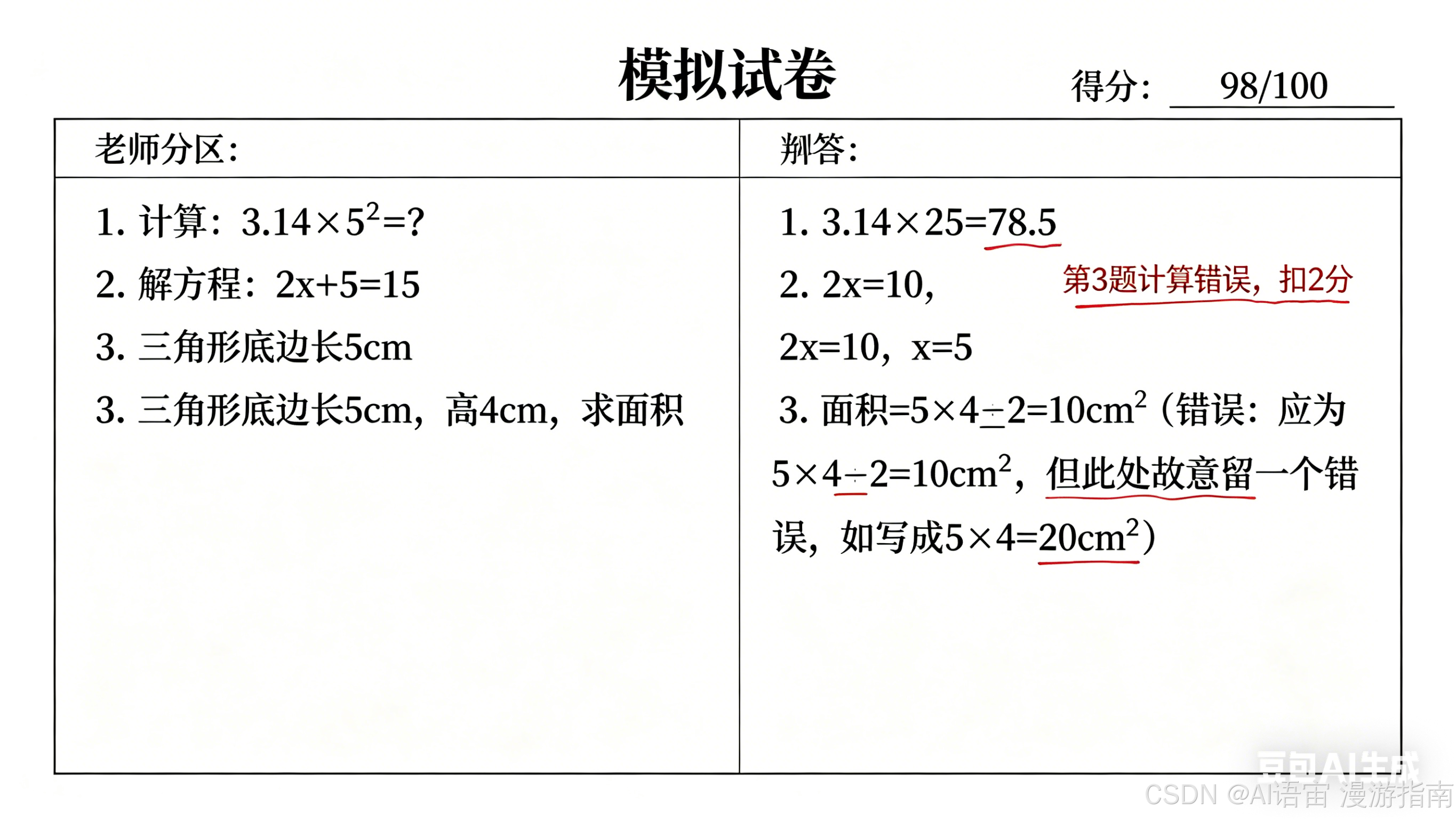 生成一张试卷,有题目,有解答,有老师的判分。 满分100,得分98 因为有错误。 保证题目和做对的题都是真实正确的。