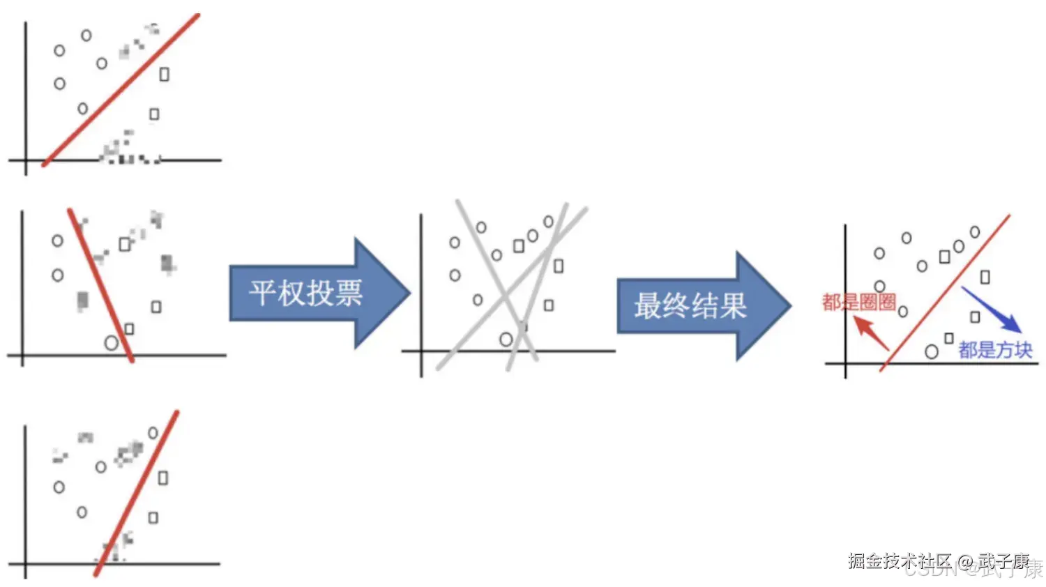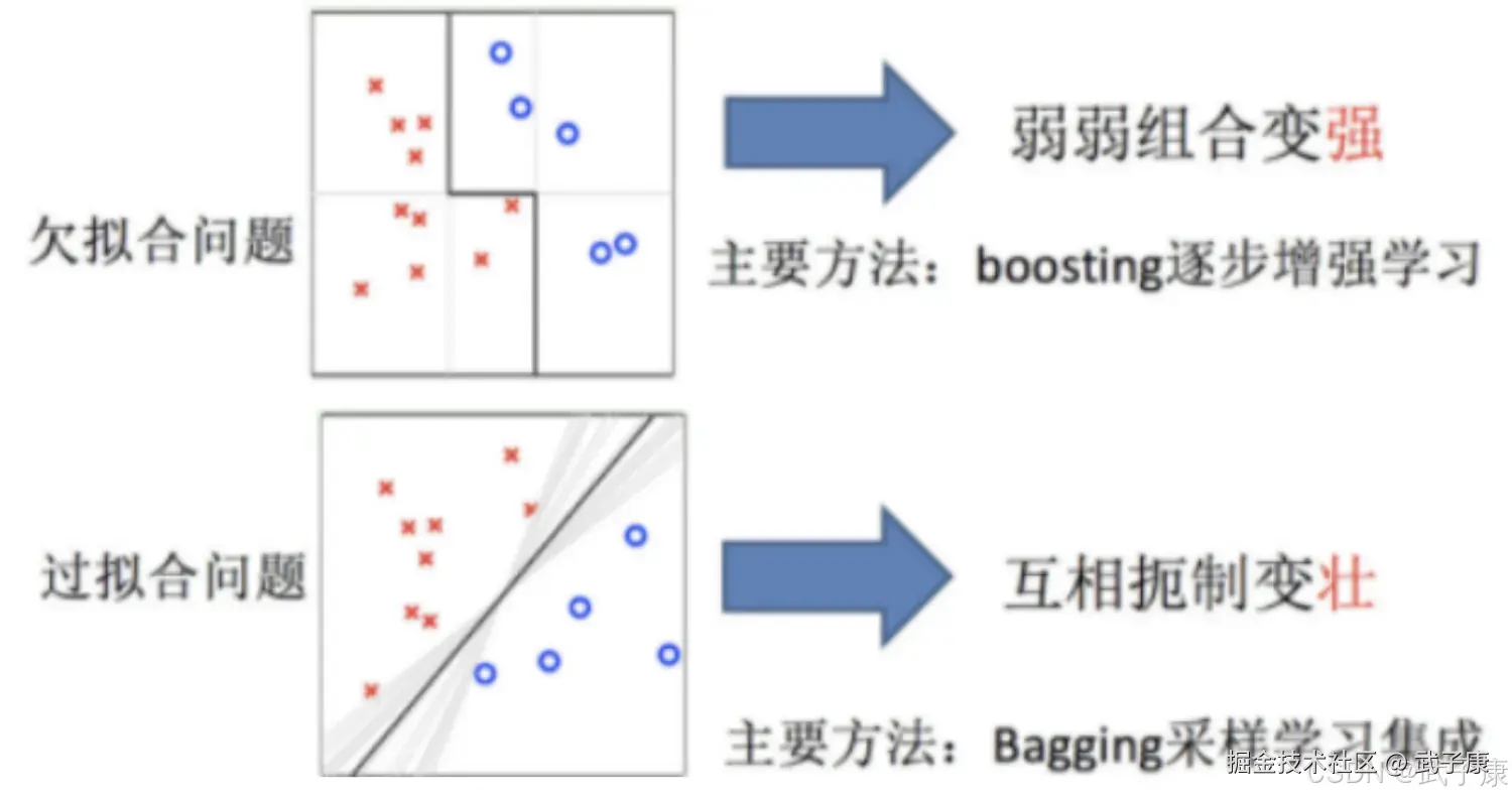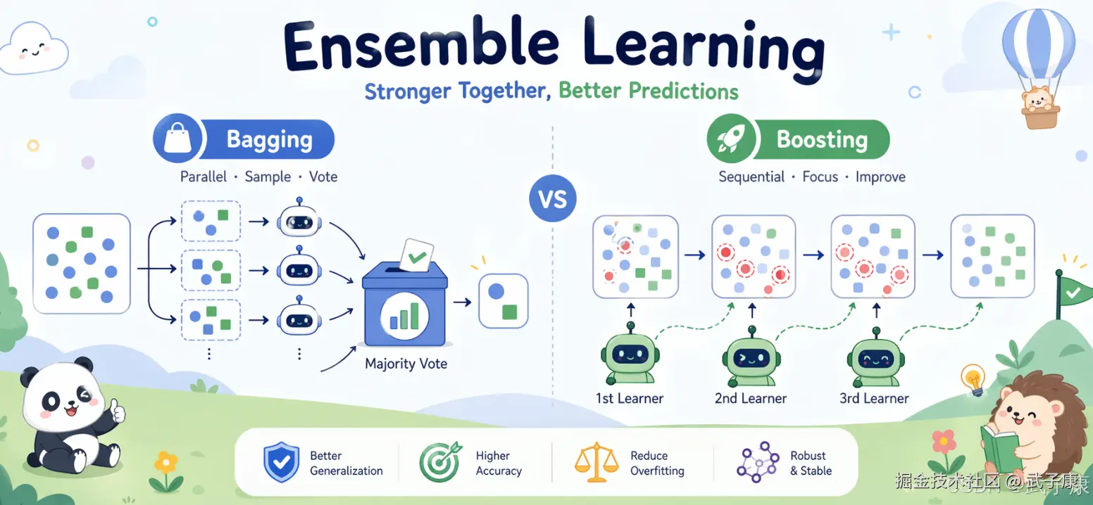 不指望单个弱模型"包打天下",而是构造一簇互补的基学习器并让它们投票/加权,用"群体智慧"提升泛化能力、稳定性和鲁棒性。