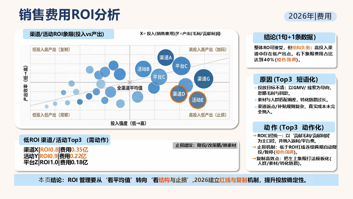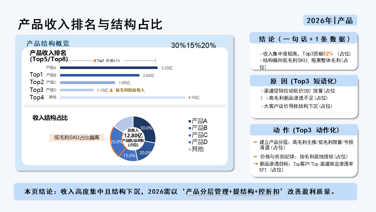 模板统一口径定义、数据来源与分析逻辑,通过 KPI 仪表盘、预算拆解、产品 / 渠道 / 区域 / 客户多维分析、盈利与现金流诊断、风险预警等模块,快速定位经营短板、归因根因、输出可落地行动方案,实现 "数据可视 --- 问题可追 --- 责任到人 --- 结果可保"。