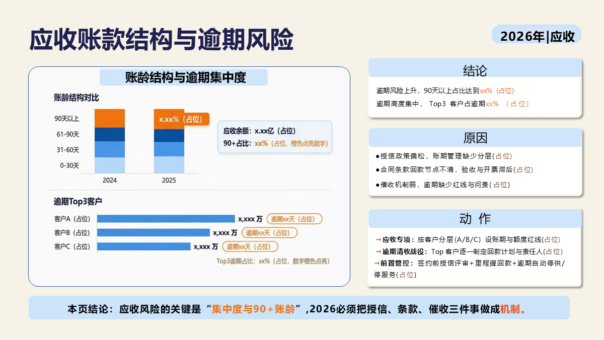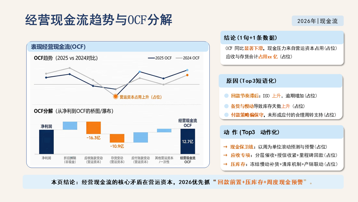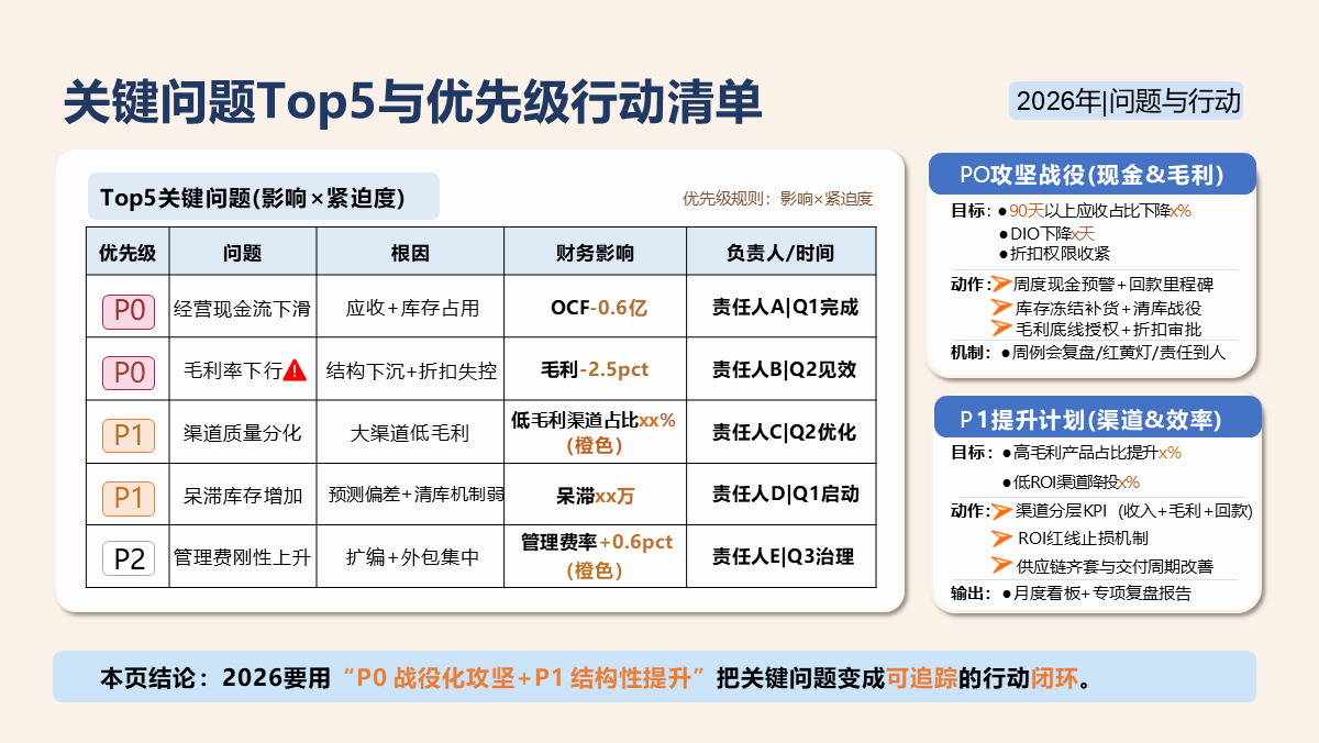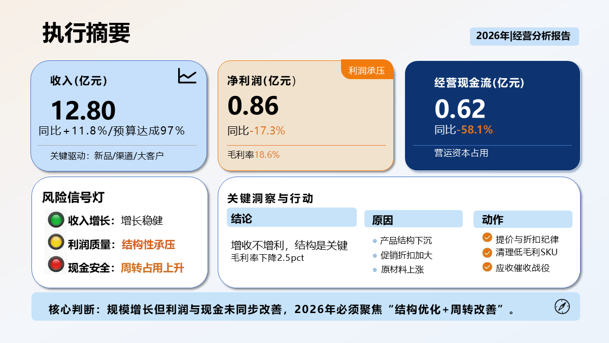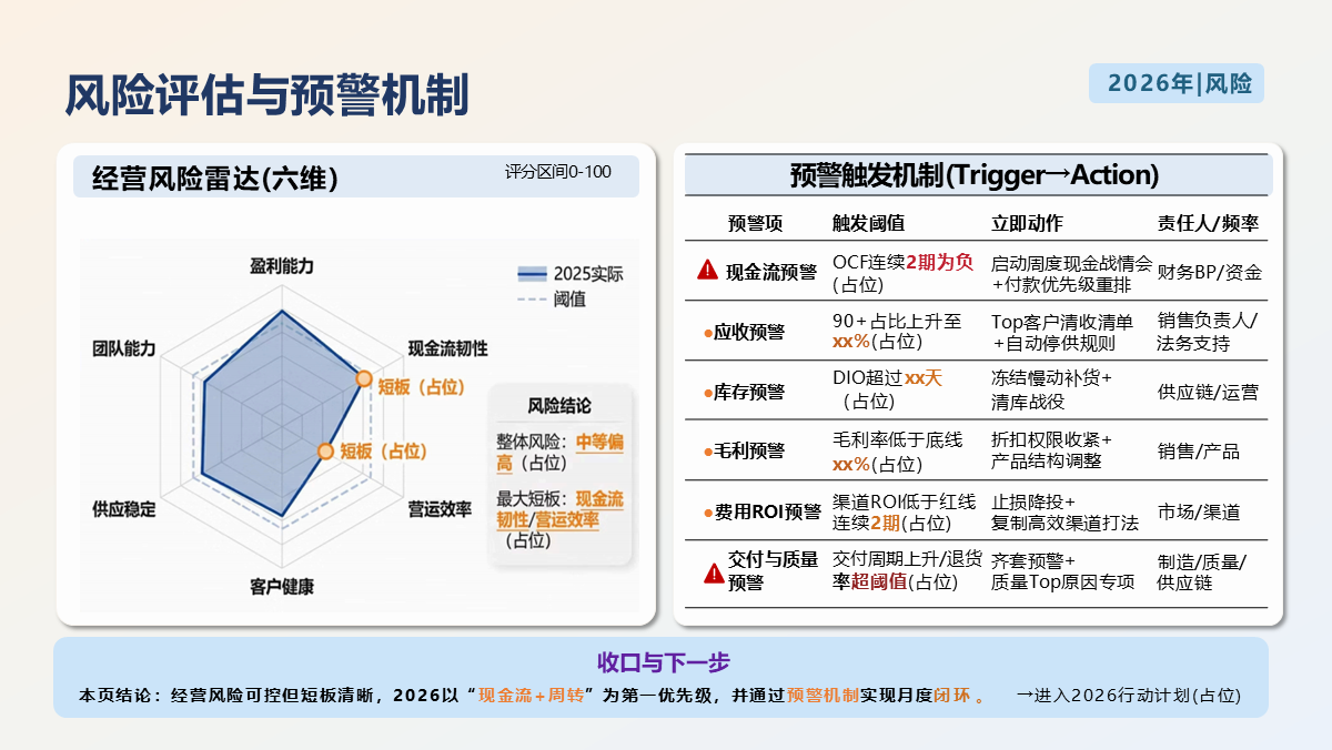 重要性总结:本模板是一套年度复盘 + 战略规划双闭环的标准化经营分析工具,紧扣 2026 年经营管理需求,覆盖执行摘要、财务表现、业务分析、运营效率、关键问题、目标体系、策略地图、行动路线、资源保障九大核心模块。