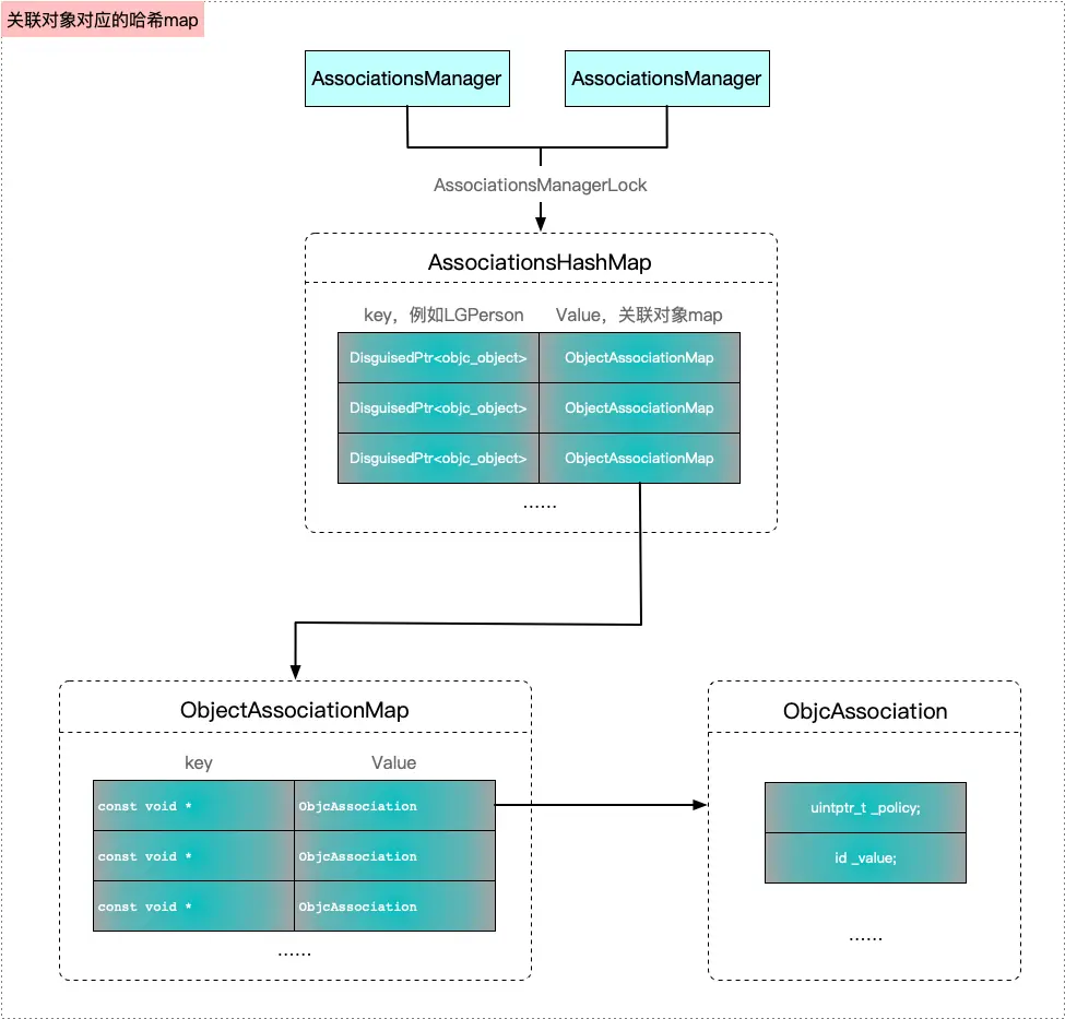 上面的例子我们简单实现了关联对象的流程,下面我们看看关联对象的底层。主要是一个双层哈希表结构