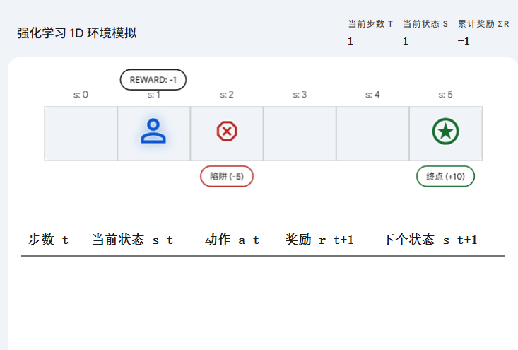为了更直观地感受这三个变量是如何运作和记录的,请看以下"智能体",在一个一维网格环境中执行"动作",并观察"状态"和"奖励"是如何生成的。智能体每走一步奖励-1,掉入陷阱奖励-5,达到终点奖励+10,他的优化目标就是最大化奖励。