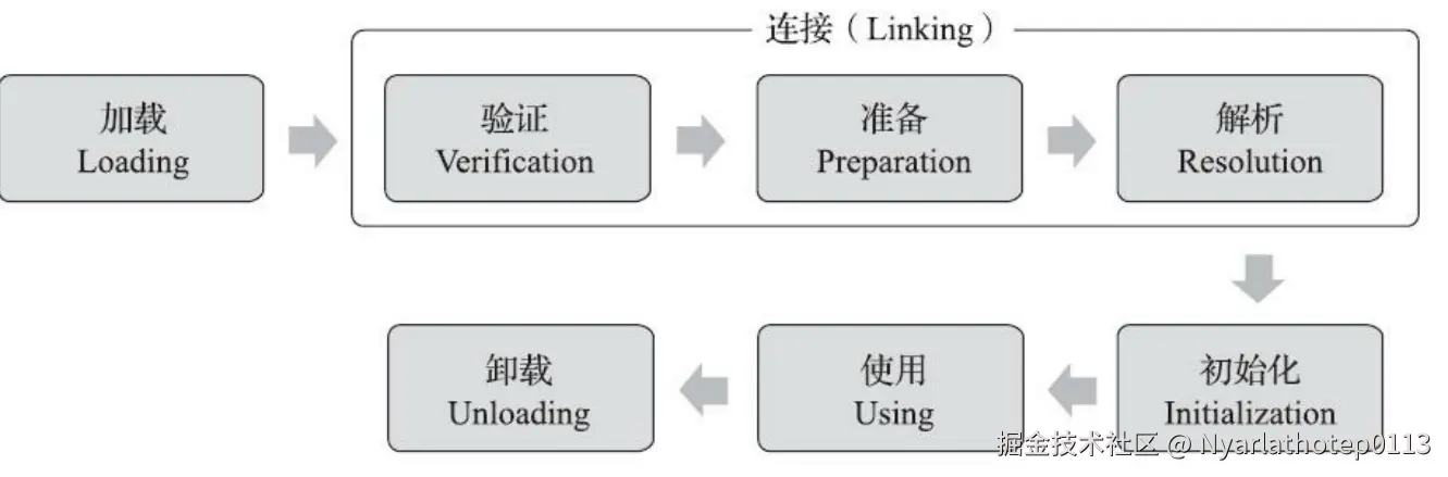 一个类型被加载到虚拟机到卸载,整个生命周期分为7个阶段: