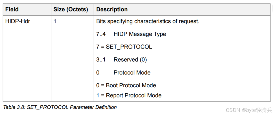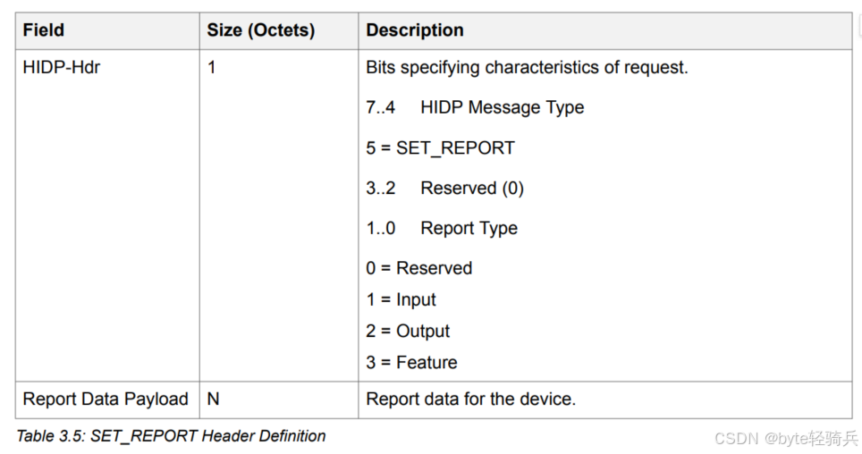 | 7-4 | 消息类型(HIDP Message Type) | 定义消息的核心类型,如握手、控制、数据传输等 |