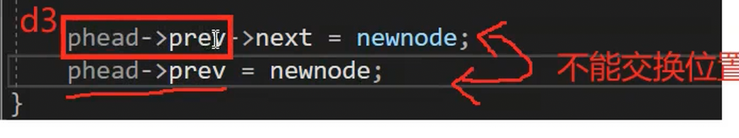 思考一下 交换位置 主要是第二句话 等价于 newnode->prev 指向新节点 就不是 让d1指向新节点,找不到了