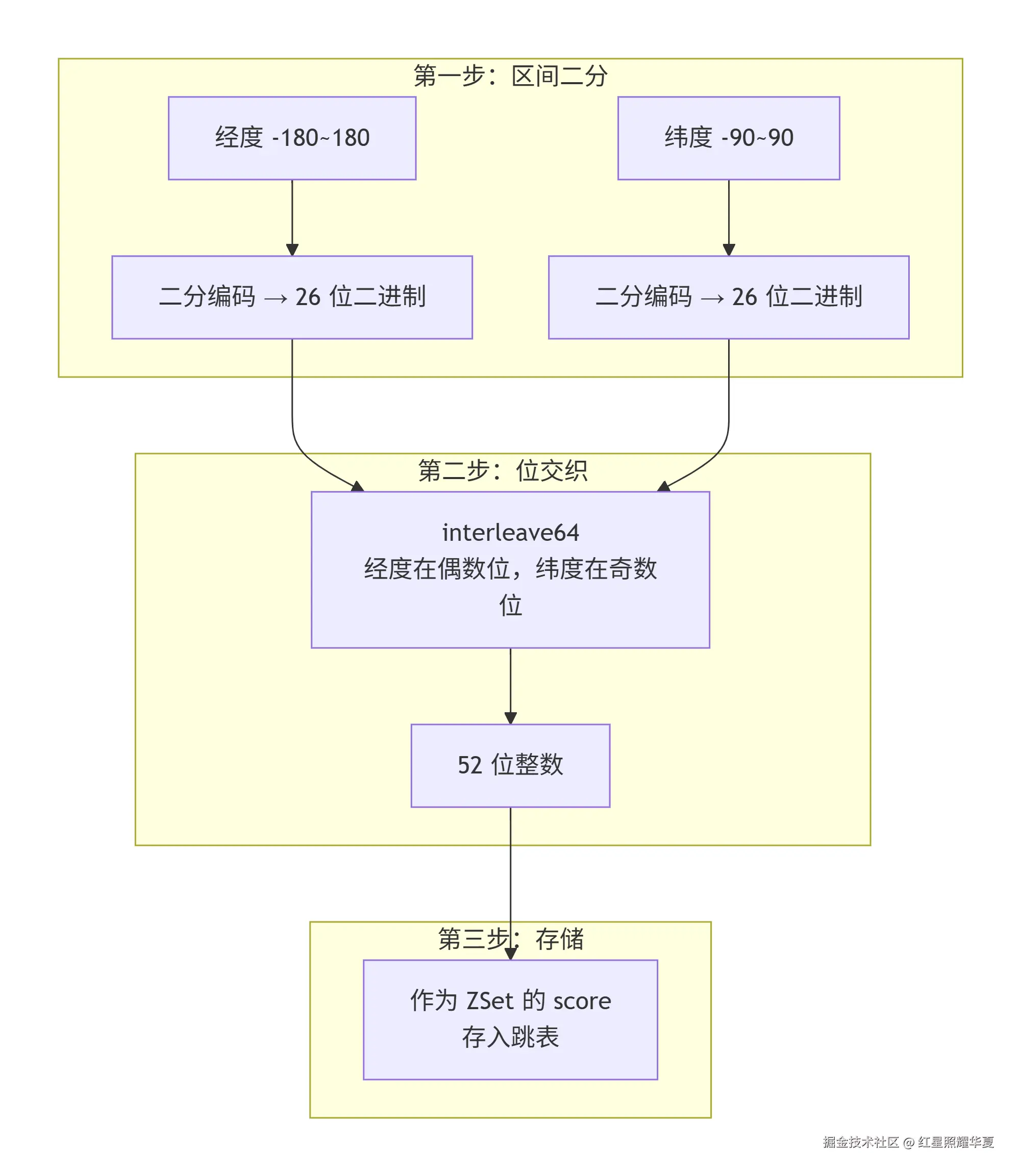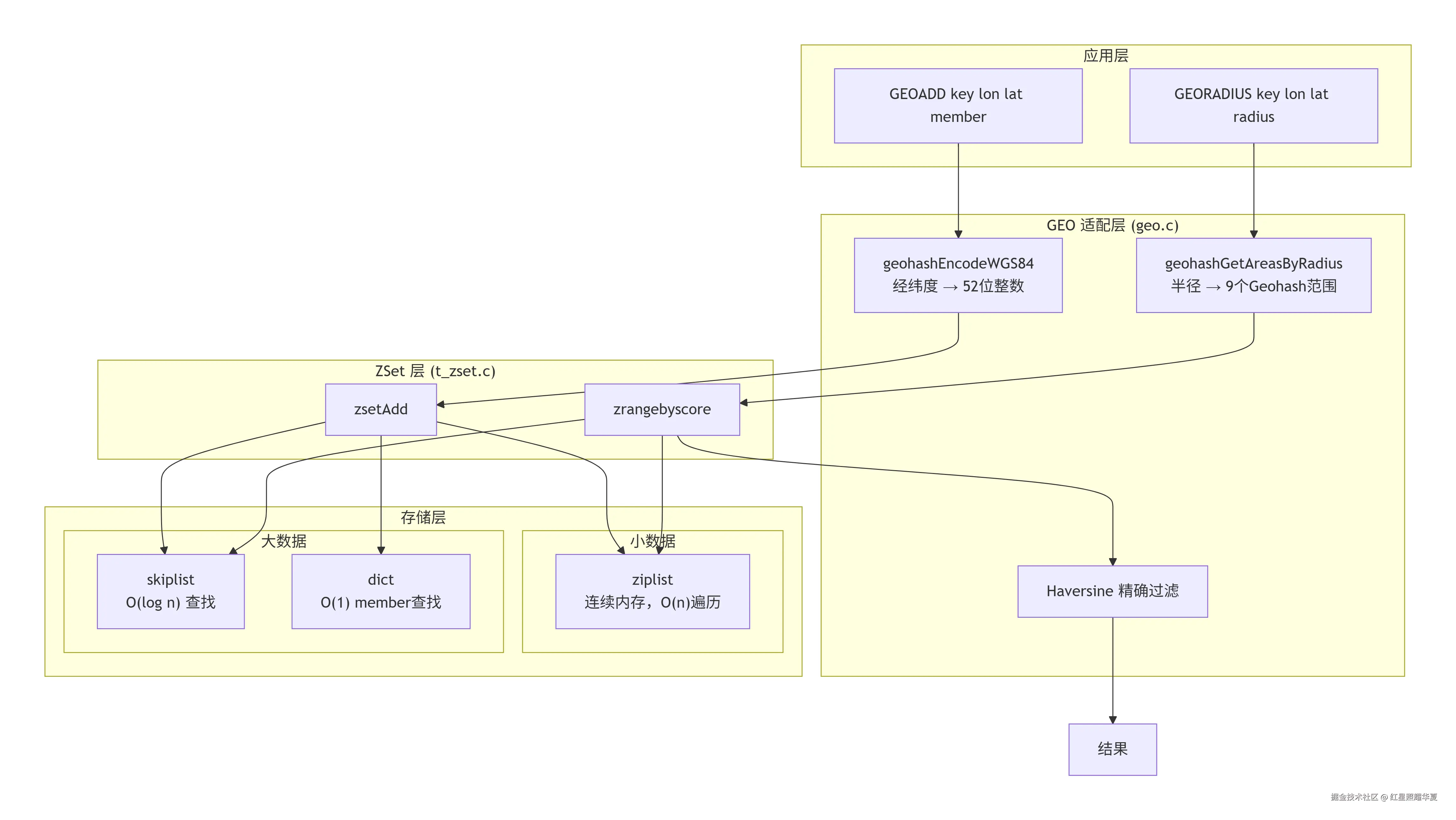 理解了这三层,你就能明白为什么一个 GEOADD 命令背后,是一条从经纬度到二进制位、从位交织到 Z 阶曲线、从跳表到球面距离公式的完整技术链。