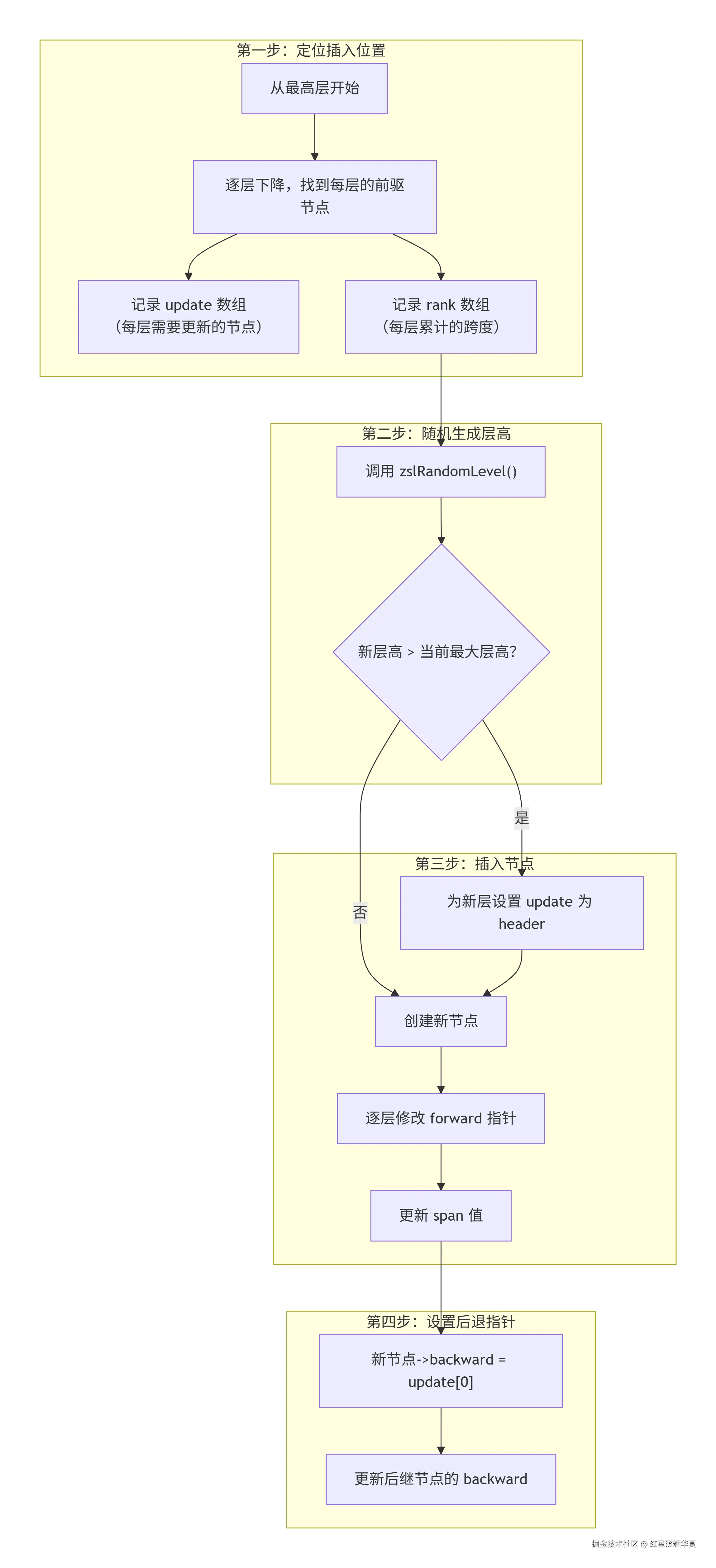 插入操作是理解跳表最核心的环节。Redis 的 zslInsert 函数执行以下步骤:
