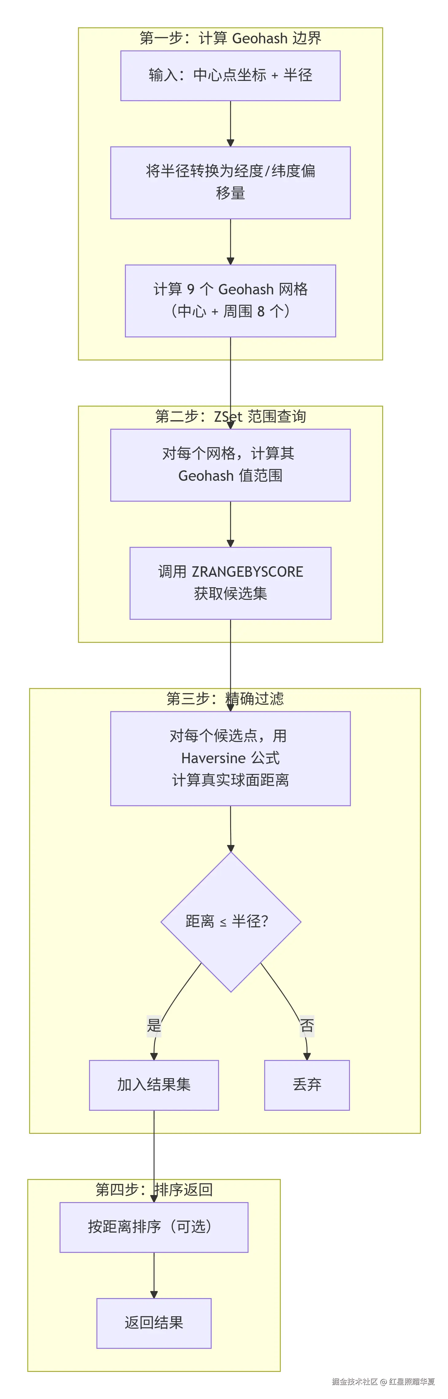 - GEO 层只管"翻译":把地理坐标翻译成 52 位整数,把半径翻译成 Geohash 范围。