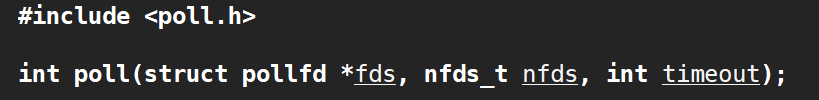 struct pollfd定义如下,我们使用poll时,在外部创建好struct pollfd数组,为每一个要关心的fd初始化数组中的sruct pollfd,完成后将数组传入poll的参数fds,参数nfds填写数组中有效的pollfd数量即可。