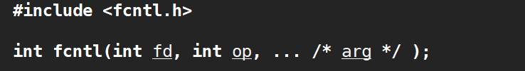 fcntl接口如下,第一个参数是要操作的文件的文件描述符,传入op的值不同,后面追加的参数就不同。表示获取和设置文件状态标记的op值分别为F_GETFL和F_SETFL。